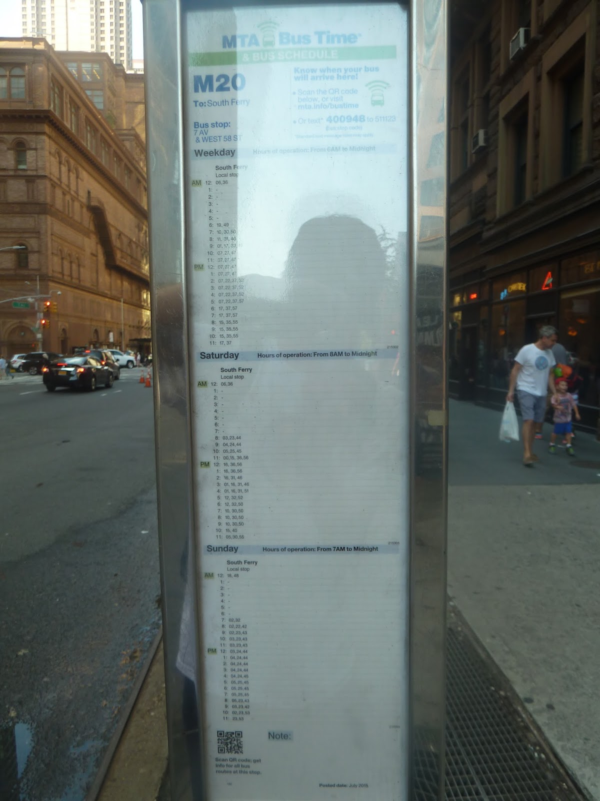 It was a Sunday, when the M20 runs every 20 minutes. The one my father and I wanted was supposed to leave Lincoln Center (the northern terminus) at 9:19 and arrive South Ferry at 10:07 – plenty of time to transfer to the 10:30 ferry. Waiting at 57th Street, the bus was due to come a few minutes after it left its first stop. But “a few minutes after 9:19” came and went. By 9:30, I was starting to get a bit worried.