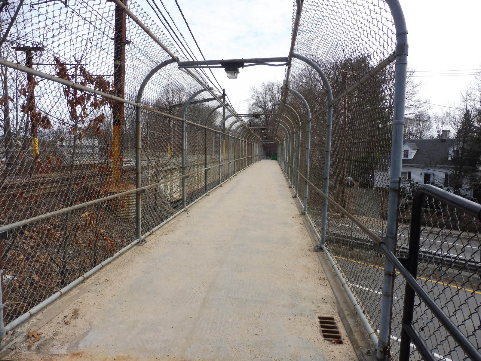 The outbound side has a staircase entrance down to the highway, but also, Eliot has a footbridge that actually goes over it. Paralleling the train tracks, the footbridge allows pedestrians to get over the massive road that would be impossible to cross otherwise. On the other side, people can descend a ramp to get to Route 9.