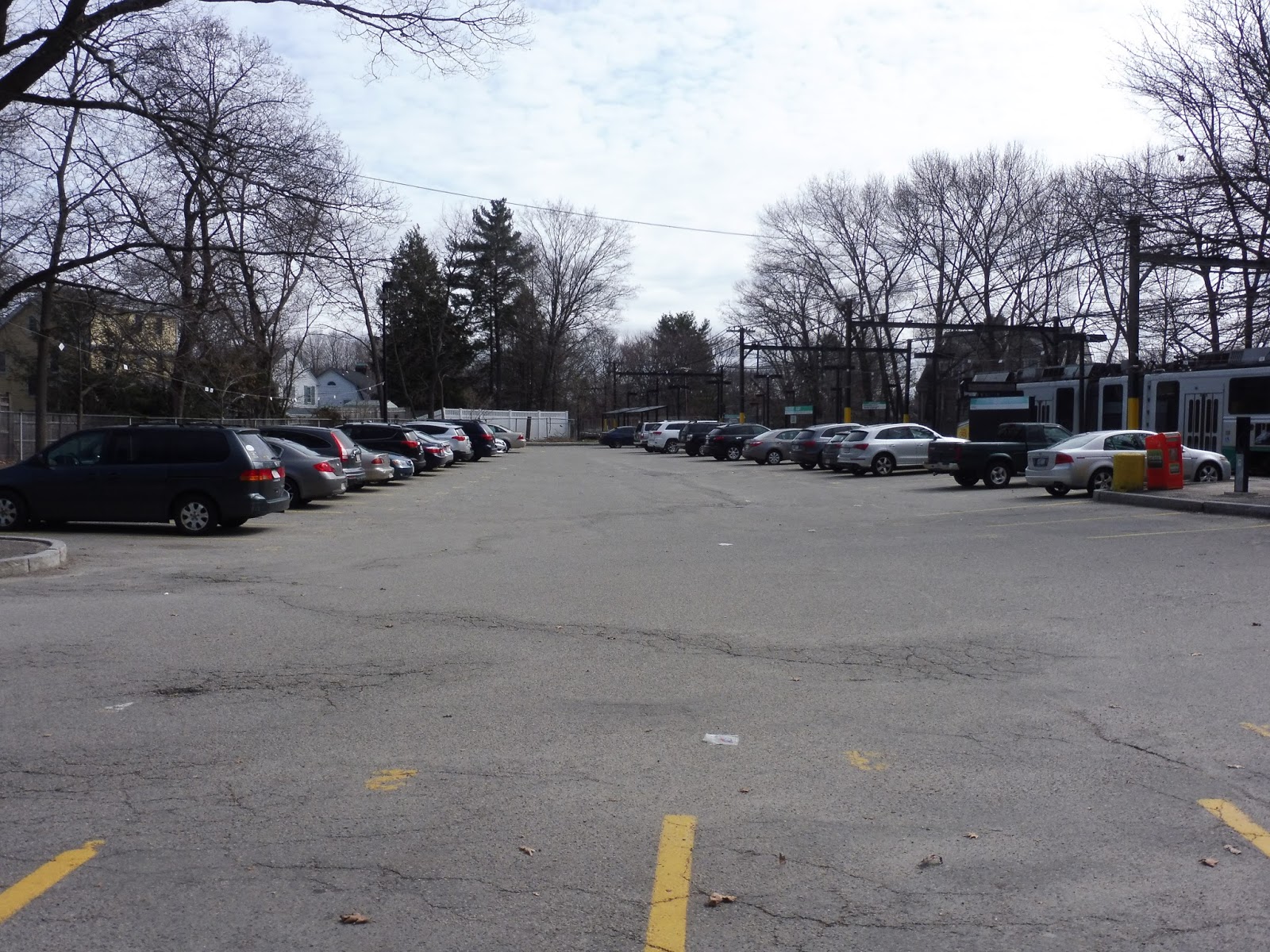 I came to this station on Lincoln Street, which has a nice T symbol at the end of it to let everyone know that’s where Eliot is. The street ends with an entrance into the station’s parking lot – it’s official MBTA parking this time, with a whole 55 spaces! Okay, so that’s not nearly enough. At least the station also has 16 bike spaces next to the parking lot, and 22 sheltered ones on the inbound platform. Another pedestrian entrance leads from Meredith Ave, on the other side of Eliot.