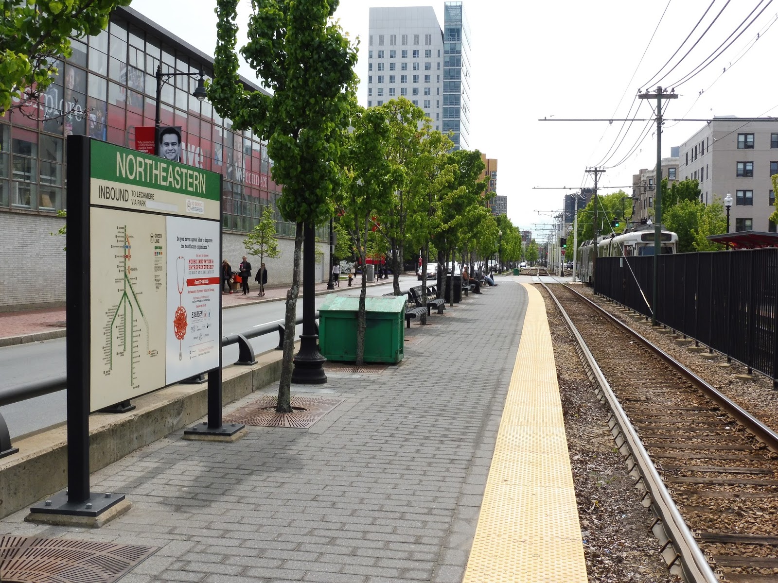 The saga of reviewing Green Line street stops starts right now! The section of the E from Northeastern to Brigham Circle is one of the nicest street-running sections of the Green Line. Of course, it’s the E, so the likelihood of trains being on time is about 0.000001%, but hey! It looks great! Let’s start with the first station out of the portal, Northeastern University.