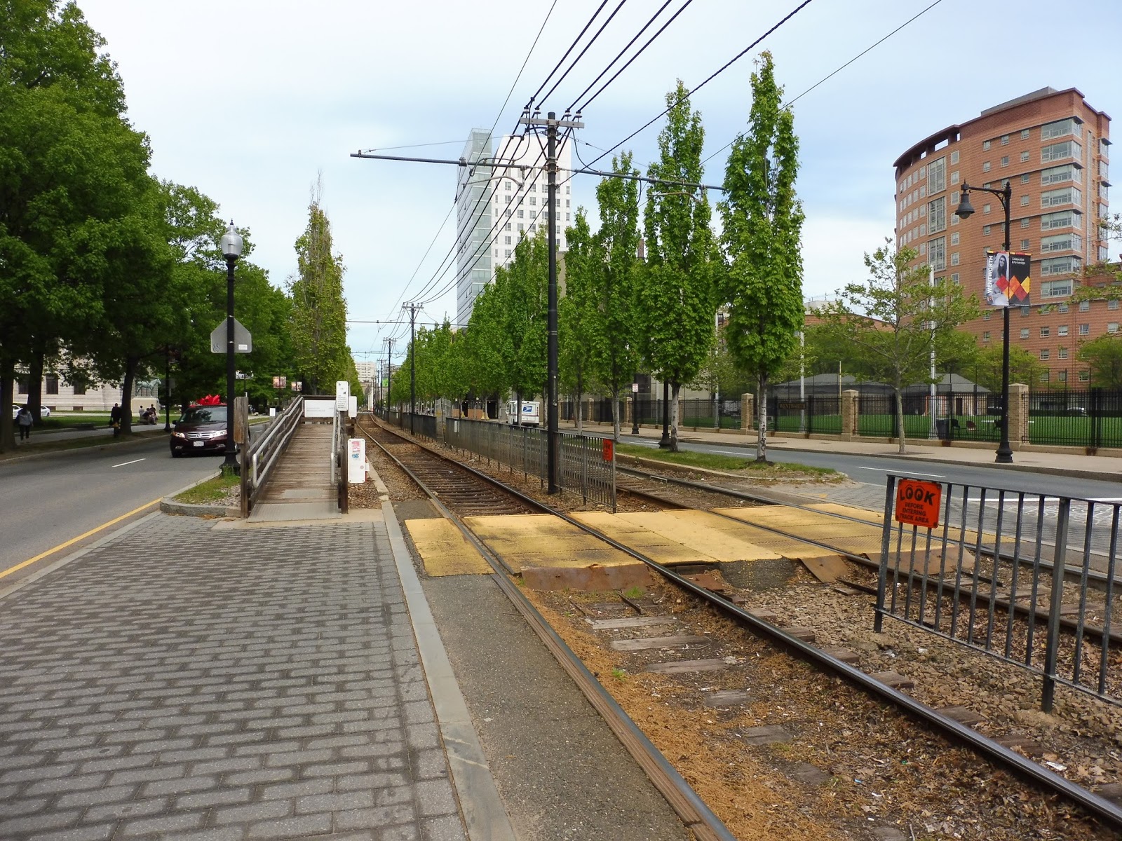 There are great pedestrian facilities here, with crosswalks on either end of the station. But what’s this on the outbound side, way at the end of the platform? A wheelchair ramp? What? Yes, Museum of Fine Arts features one of very few wheelchair ramps on the street-running sections of the Green Line. It’s also completely useless, since there are these newfangled things called low-floor trains. Don’t know if you’ve heard of them.