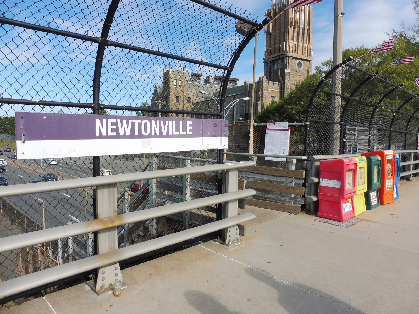 Like Auburndale, Newtonville is right next to the wide Mass Turnpike. It offers two entrances at overpasses on either side of the platform: Walnut Street and Harvard Street. They’re both pretty much the same, with a sign, schedule, and a few newspaper boxes on the Walnut Street side. For the record, Newtonville apparently has 53 parking spaces, but I can’t for the life of me find them on Google Maps.