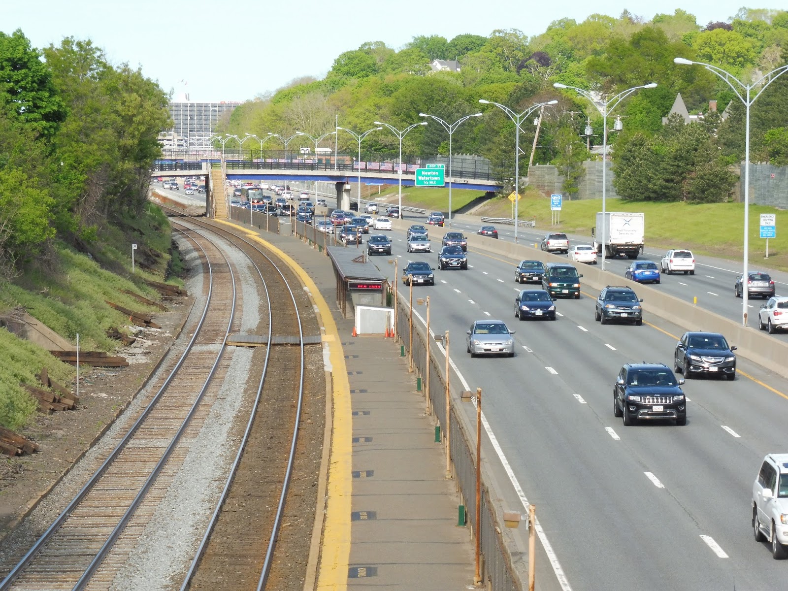 Now, one huge problem with Newtonville (and the other I-90 stations) is that it only has one platform. That makes this whole section of the line incredibly hard to schedule. But the worst part is that you can actually see the remains of the old second platform at Newtonville! If all the I-90 stations had two platforms, the MBTA could get a lot more flexibility when scheduling Worcester Line trains.