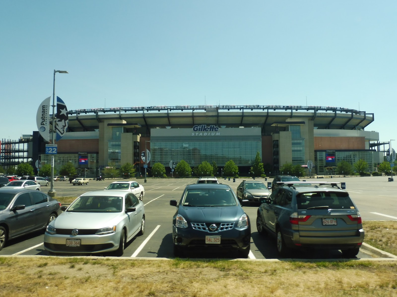 However, we eventually turned onto the dreaded Route 1, which seems to bring pittiness wherever it goes. It wasn’t as bad as Saugus, but there were still some pretty ugly businesses and motels along here. As the street grew wider, we turned off to serve Patriot Place. Yes, we were at Gillette Stadium!