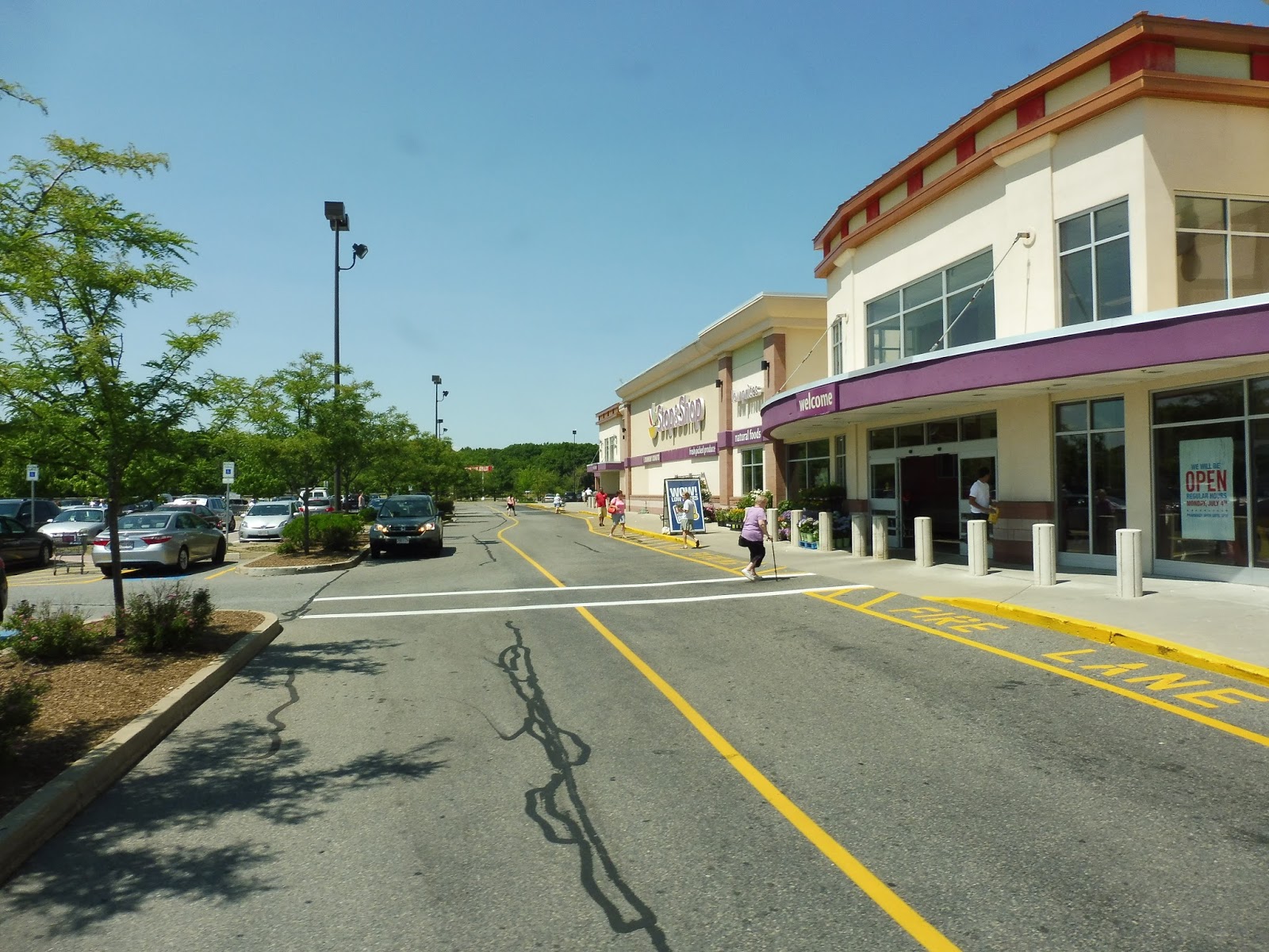 Now back on Elm Street, we travelled along the back side of Legacy Place, then crossed over the wide Providence Highway. Next, we turned onto Washington Street, joining the 34E. After some houses, we unexpectedly pulled into the Dedham Plaza, but then went around the side of the building to do a loop around the main lot along the Providence Highway. And guess what? No signage.