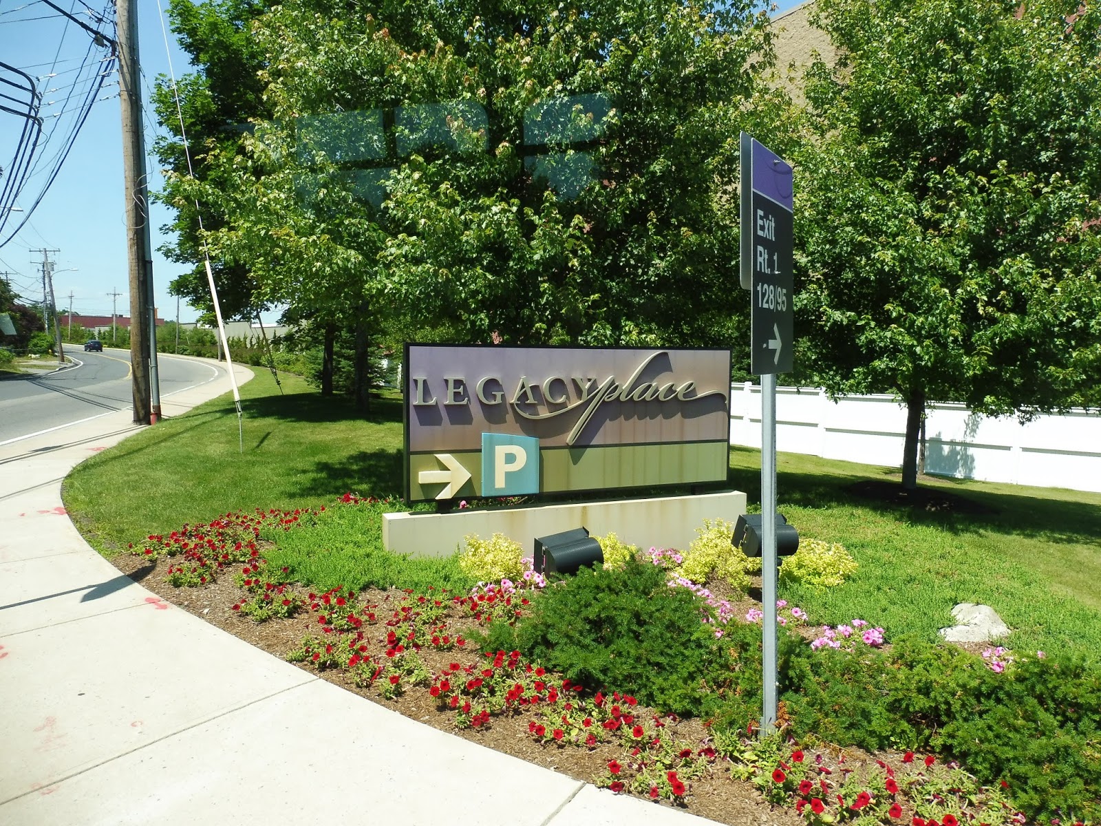 We passed Dedham Corporate Center Station, as well as some apartment developments across the street. The street then became Elm Street and curved north, where we made the first of many deviations of the route, pulling into a backlot at the Legacy Place Mall. And yeah, it’s great that the route directly serves Legacy Place, but how about putting up some signage there? Geez!