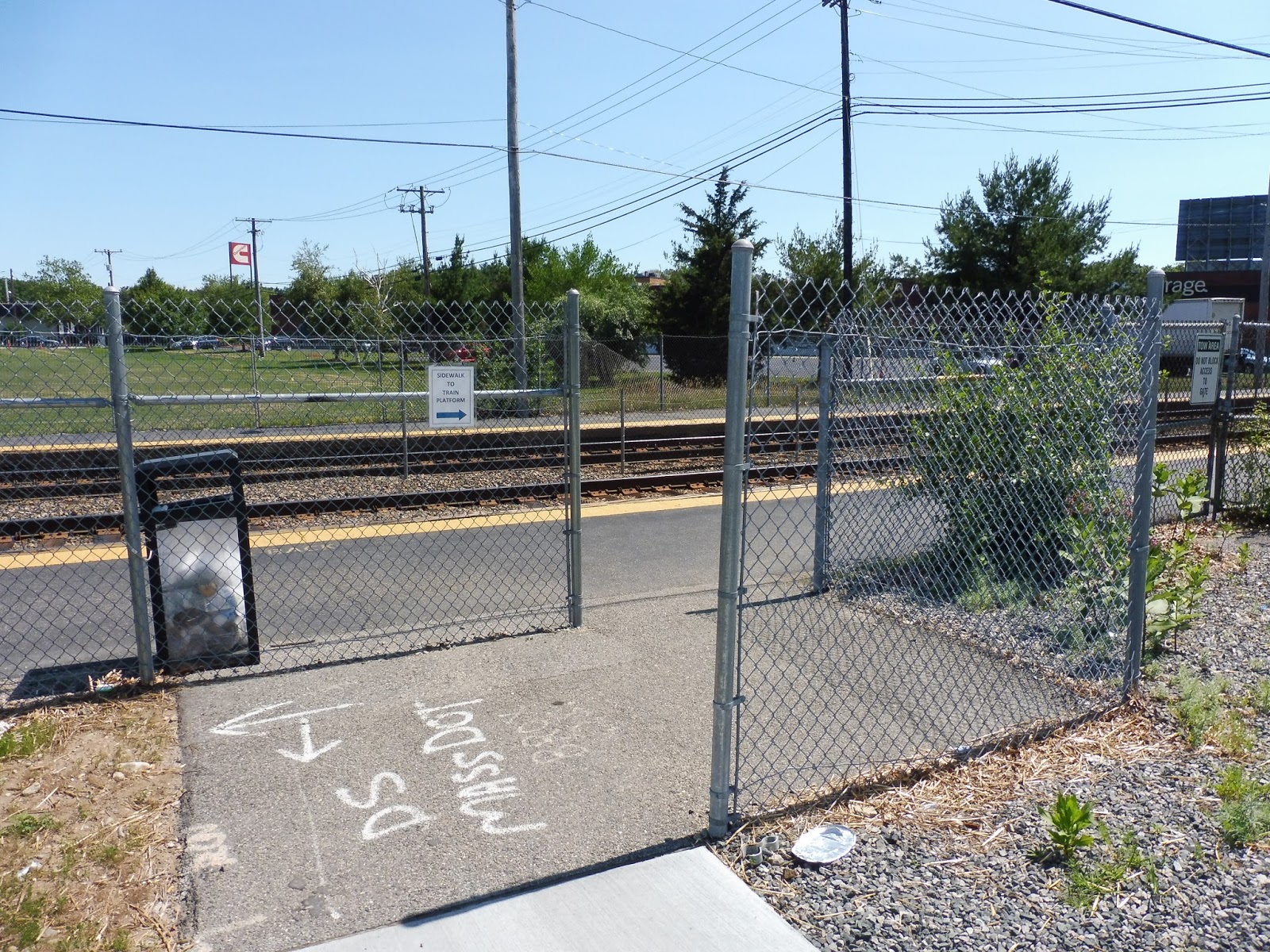 I came into the station from Rustcraft Road, which is where the Dedham Local Bus runs (no signage, for the record). There’s a small kiss-and-ride drop-off area here, and it was built in 2014. It’s just a stretch of road with a sidewalk – no benches, no wastebaskets, nothing. Also strange is the fact that you have to walk a ways back to get to this odd chain link fence entrance to actually get into the station.