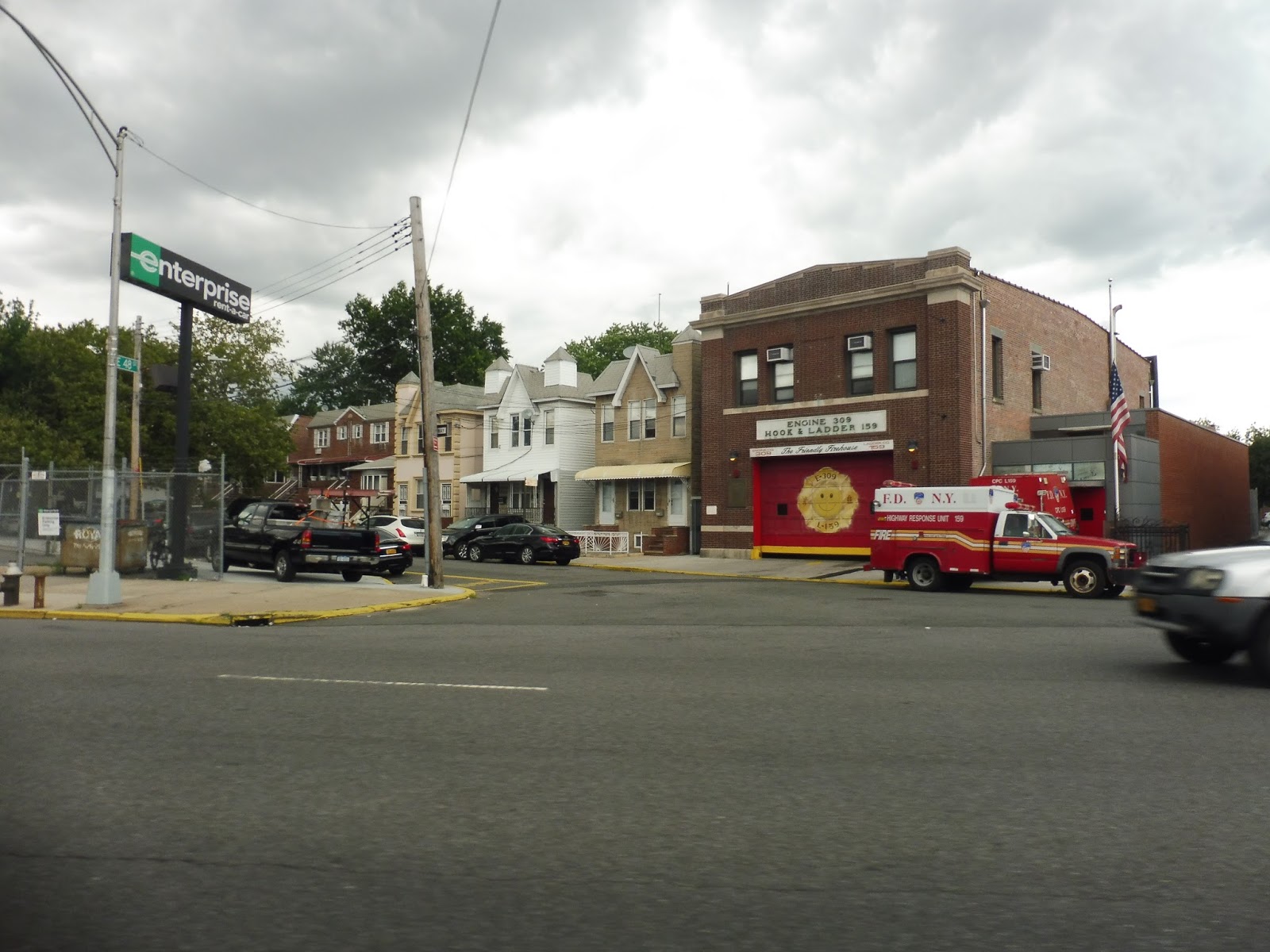 We headed onto Flatbush Ave, passing a huge shopping mall and a very tall apartment tower. After that, the street became lined with smaller buildings, mostly businesses with apartments on top. Flatbush Ave is a diagonal street within the grid, so we were intersecting with both vertical streets and horizontal avenues.