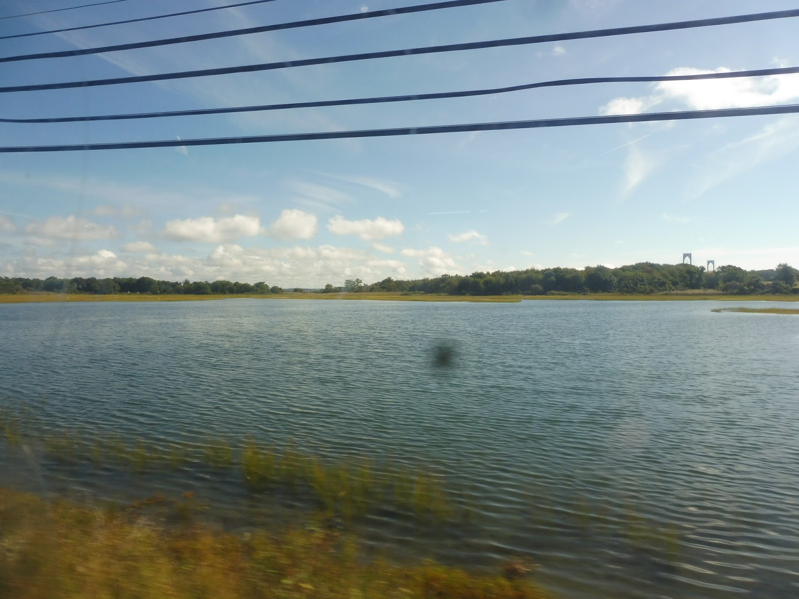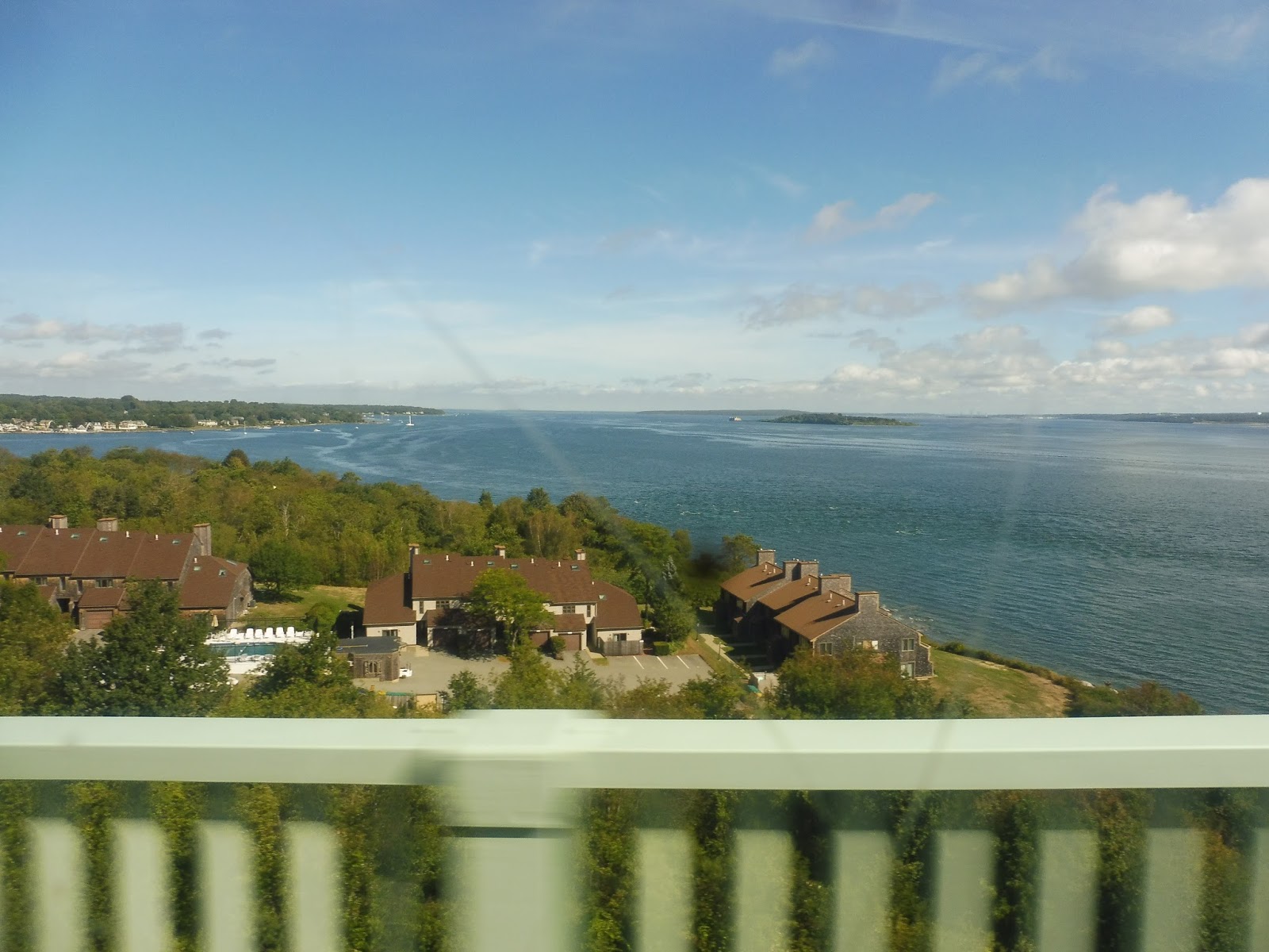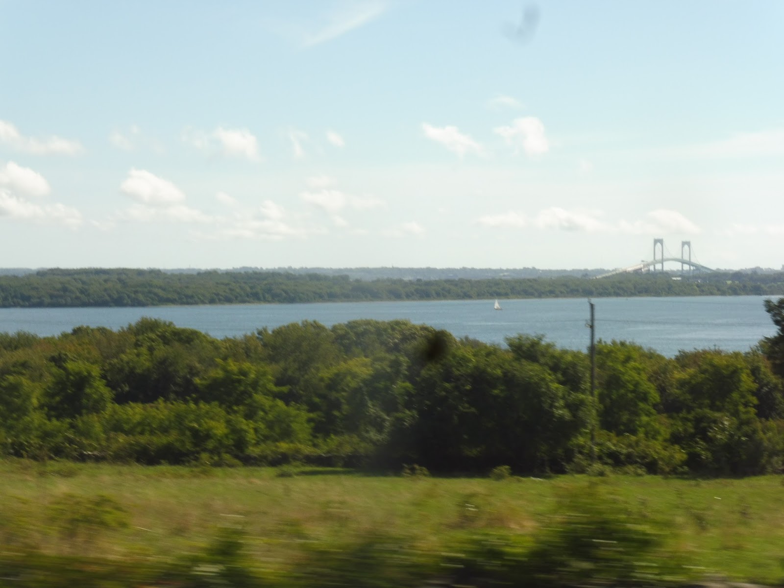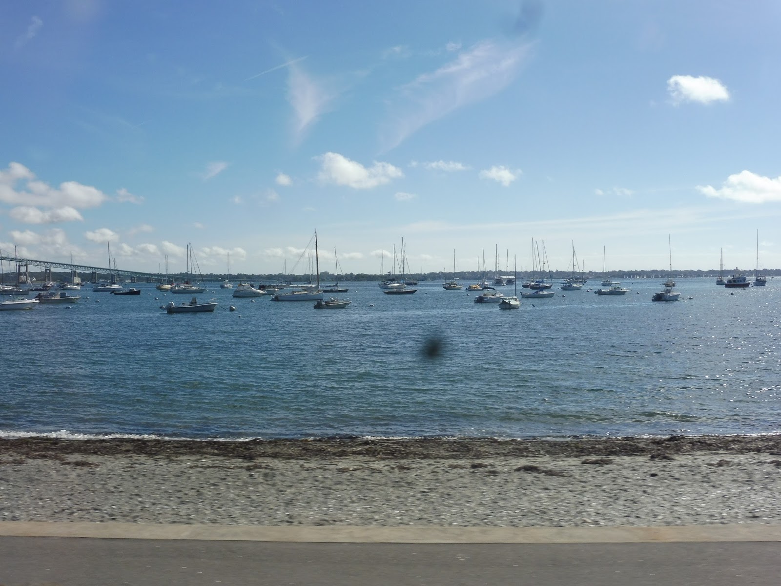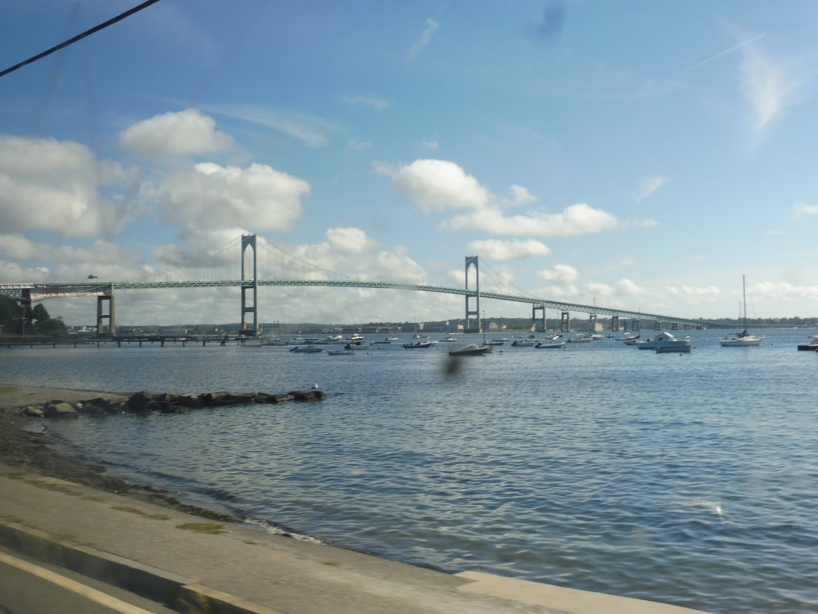 We passed through a toll, then took the exit into Jamestown. Merging around a little pond thing in the interchange, we headed down East Shore Road, which took us onto Conanicus Ave. We went by a police station on one side and a golf course on the other, then the street became lined with nice houses. Next, the road came up along the coast, and my immediate reaction was to force myself past Sam to the other side of the bus in order to get a picture. Sorry, Sam…