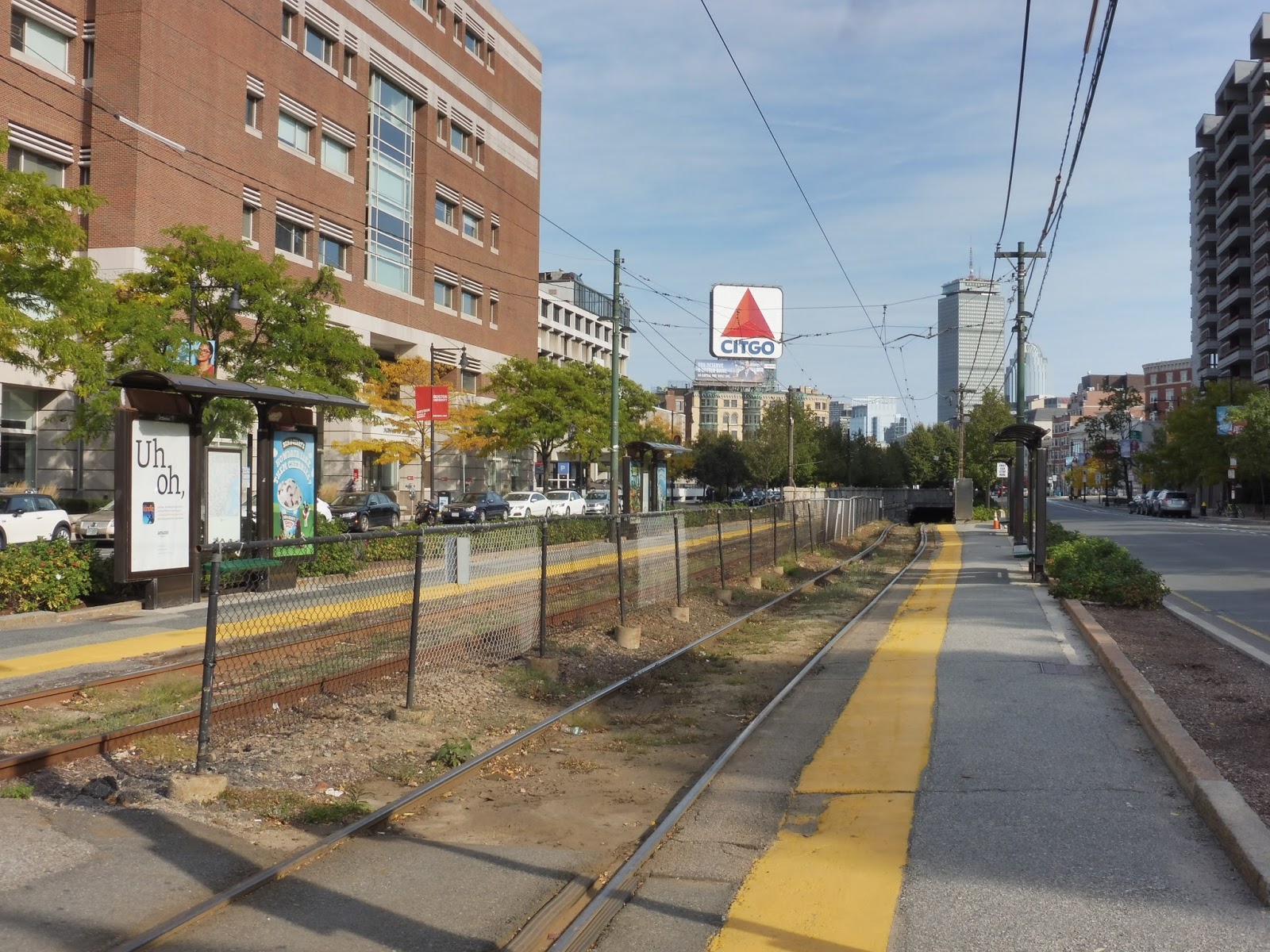 Blandford Street is the first station out of the portal for the B, and it’s right near Kenmore Square – this means there’s a nice view of the Prudential and the Citgo sign. So what about the station itself? Honestly, it feels a lot like an E Line station, minus the ADA platform. There are two shelters on each side, and the right-of-way is reasonably pretty!