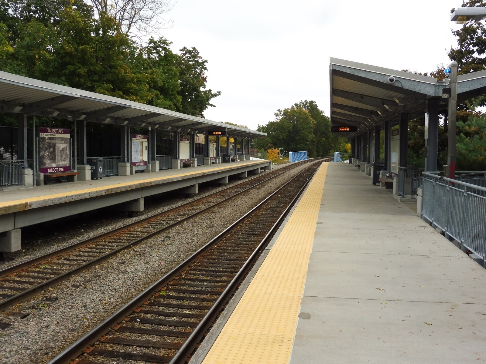 Pros: The station certainly tries to look and feel pleasant, and for the most part it succeeds. It’s weird that it manages to be as tranquil as it is, considering it’s not in the safest neighborhood. Also, Talbot Ave has a good amount of bike spaces, and even a few automobile spaces, which is a great inclusion. Finally, the platform offers shelter and seating the whole way down.