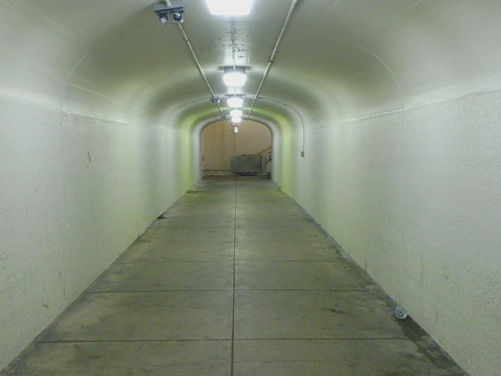 The tunnel definitely lacks the nice architecture we’ve been seeing in the rest of the station. I mean, this is just a bland, musty, echoey hallway that continues to harbor that awful smell from the building above. When you get to the other side, there’s another staircase with an old wheelchair lift – we were able to find on the lift that it was built less than 20 years ago, in 1998.