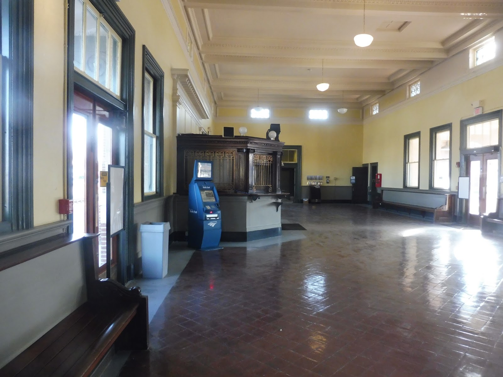 Okay, why the heck did they close this building? Just look at that! That is absolutely gorgeous! I absolutely love the old-timey ticket office, and they probably had a bunch of benches in here and maybe a café…look, they even left the Quik-Trak machine on! What a waste of energy!