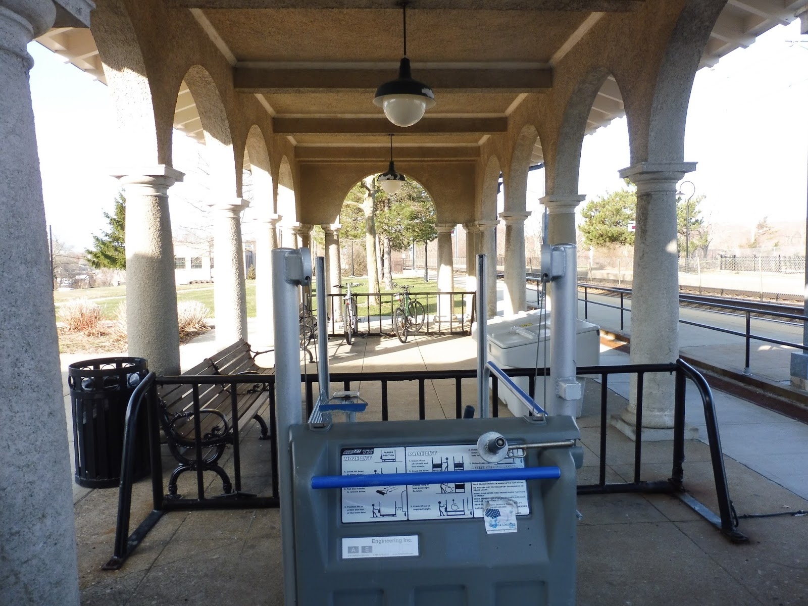 At least the northbound side does have a proper waiting area, though. I mean, look, there’s a nice shelter, a wastebasket, some benches, and a good amount of bike racks! There’s also that wheelchair lift that doesn’t seem to be movable…but other than that, I think this place is pretty goo- HANG ON, IS THAT ANOTHER RAILING BLOCKING THE WAY TO THE PLATFORM?! OH, COME ON!