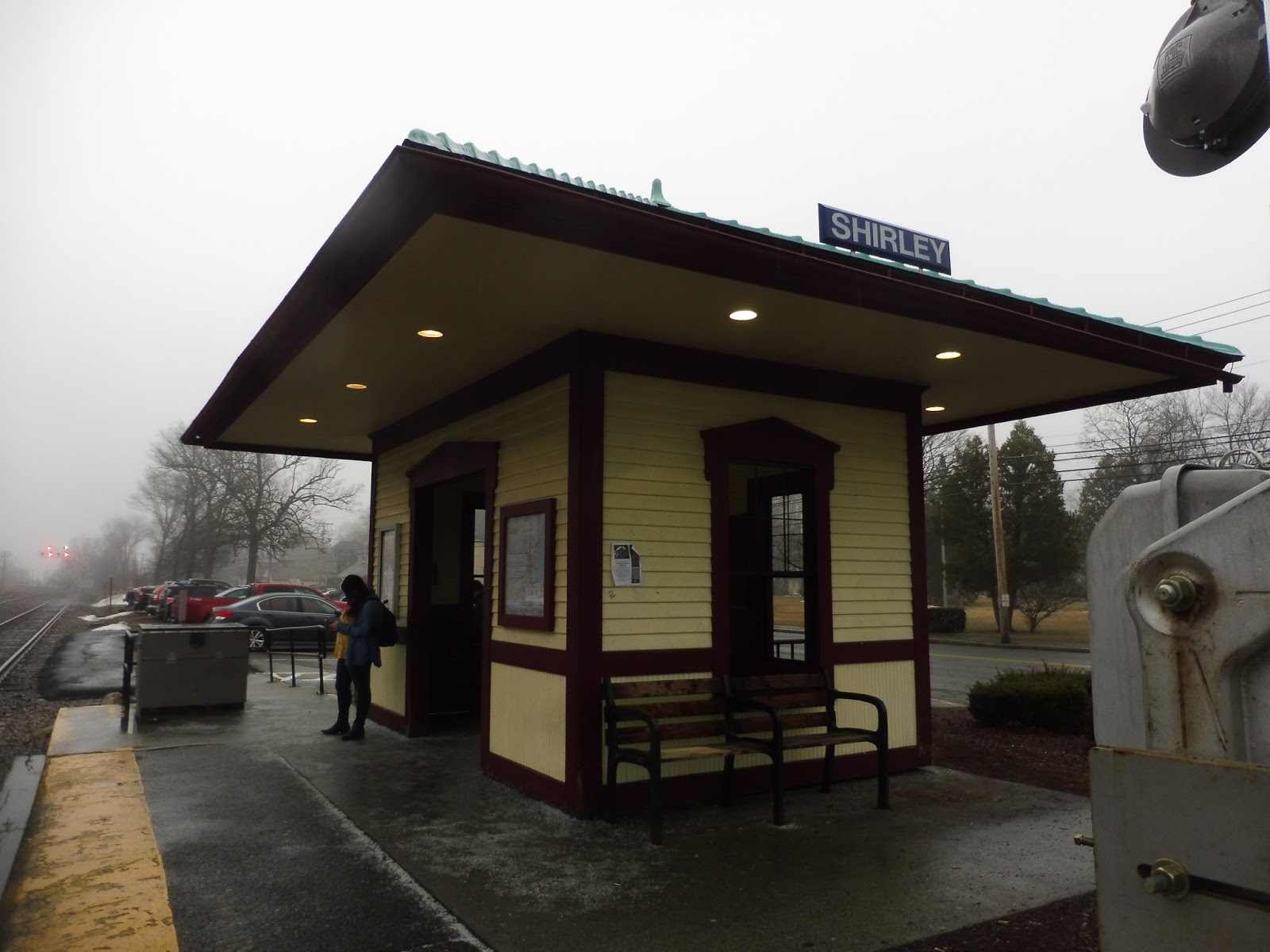 Shirley has one very very very small platform. Quite very small. However, it’s entirely occupied by a shelter that’s actually rather charming! It has some benches both outside and inside, plus lighting and information on little placards outside. There are a few newspaper boxes and a wastebasket on one end. The station has a small bike rack, while car parking is spread alongside the tracks, adding up to 25 free spaces (according to the website, at least – it looks like it’s more, though!). Interestingly, Shirley’s digital sign is across the tracks, facing the platform.