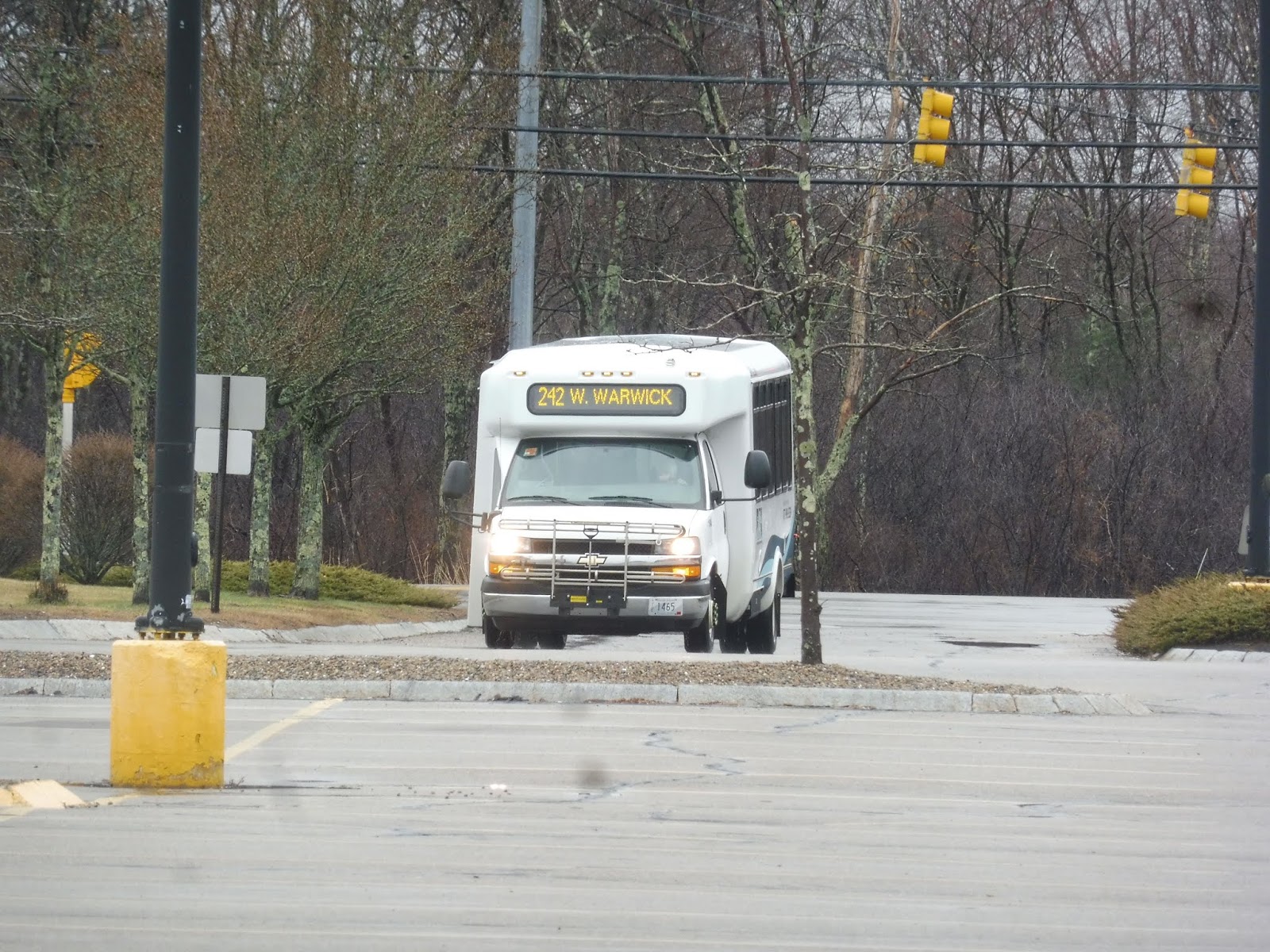 Okay, turned out it had to make a layover first. But it eventually came back, and it was time to go! We ran up Bald Hill Road through the woods for a tiny bit before turning onto Ginsu Way, then Quaker Lane. This served two purposes: turning the bus around after serving Cowesett Corners, and serving the Kent County Courthouse.