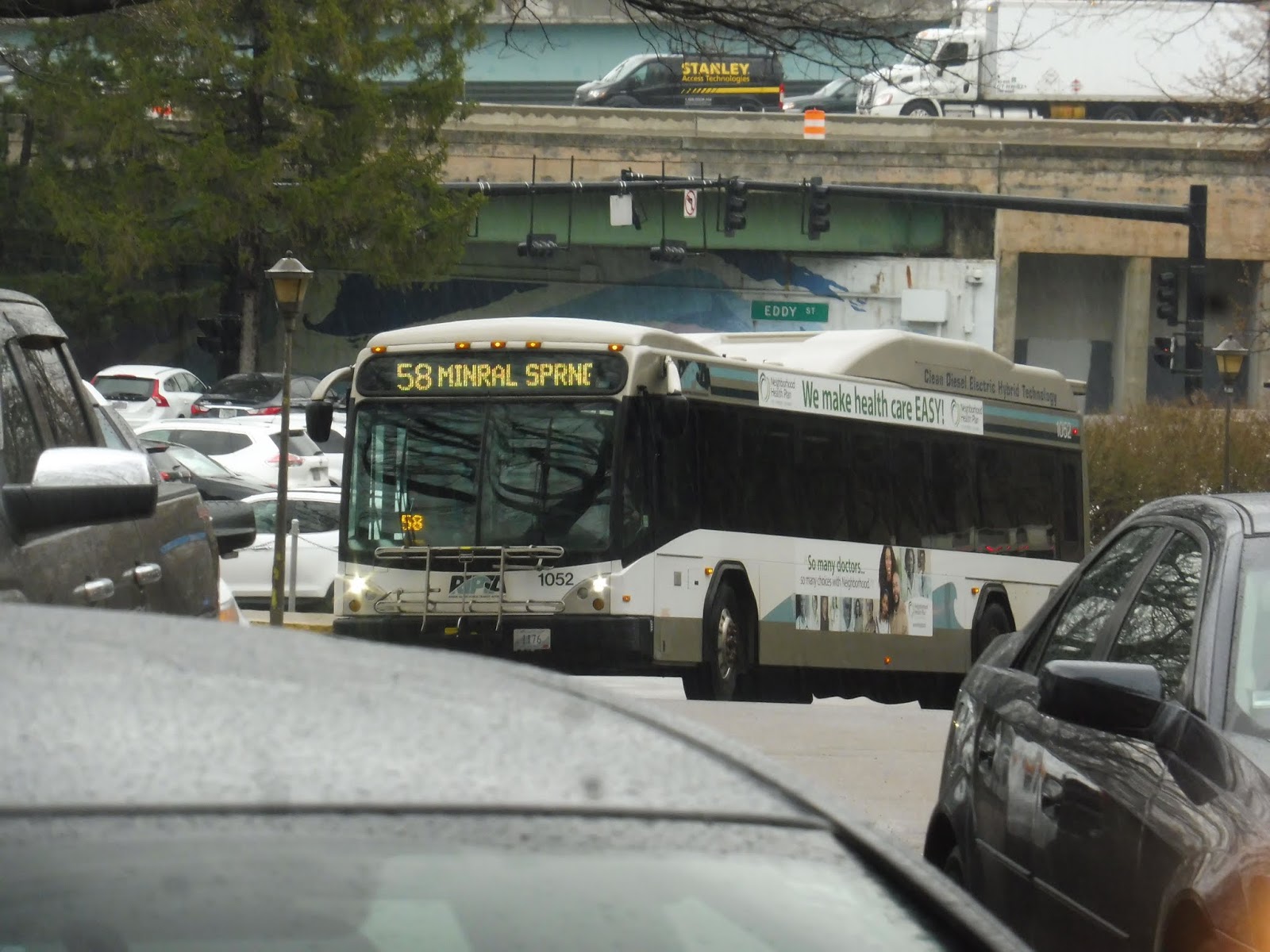 Now, the 58 doesn’t actually begin at Kennedy Plaza. It starts south of the plaza, at the Rhode Island Hospital. This is a preliminary step to creating the Downtown Transit Connector, but that’s still pretty far off, so it’s just…a one seat ride to the hospital at the moment, I guess. The route was “detouring” to the building’s front door (although it usually doesn’t), and from there, we did a loop to get onto Eddy Street.