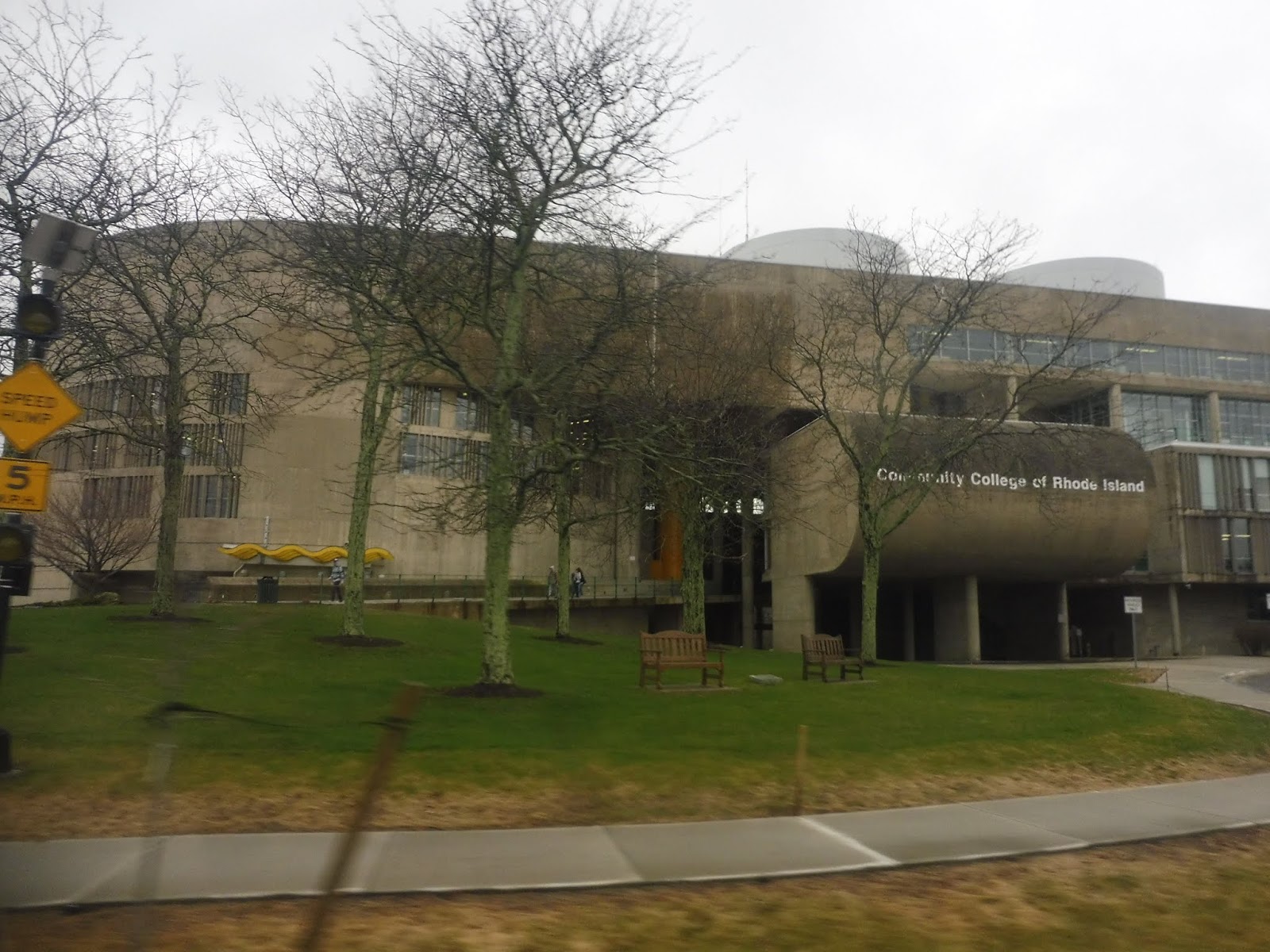 Were the deviations done yet? Nope, we now had to do one to CCRI! So we went down East Ave for a bit, then we turned onto the road up to the community college. After making the stop outside of the most brutalist building ever, we had to go allllllllllll the way to the end of the parking lot, then take a road down a hill through the total woods.