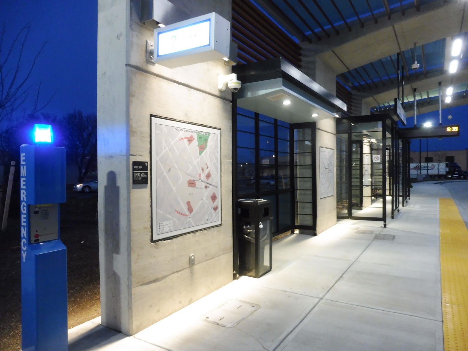 We begin with Chelsea, and we’ll use this one to describe what you get with every stop. There’s a modern shelter, bike racks, an emergency blue light, some maps, a wastebasket, and some benches. Most stations have a form of countdown clock (or at least, signs that tell you how frequently buses are coming, but I assume they’ll be countdown clocks eventually), but Chelsea doesn’t have any yet.