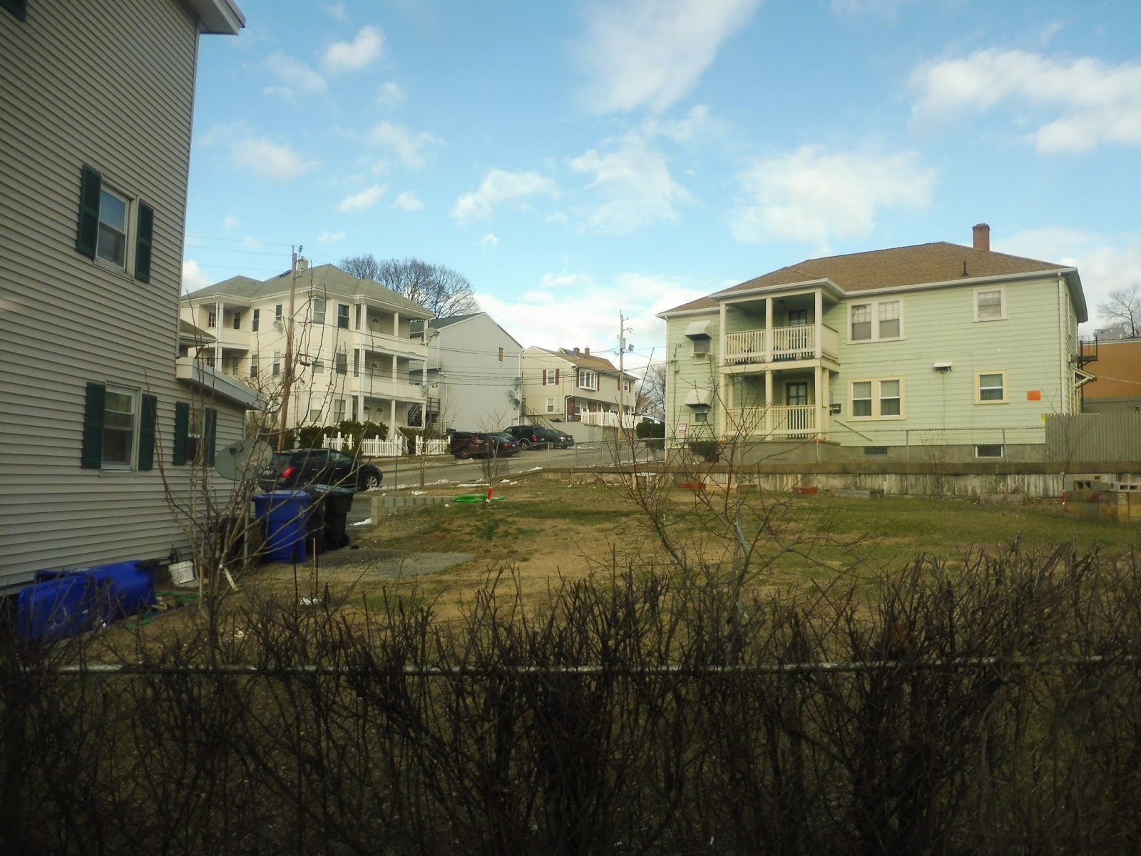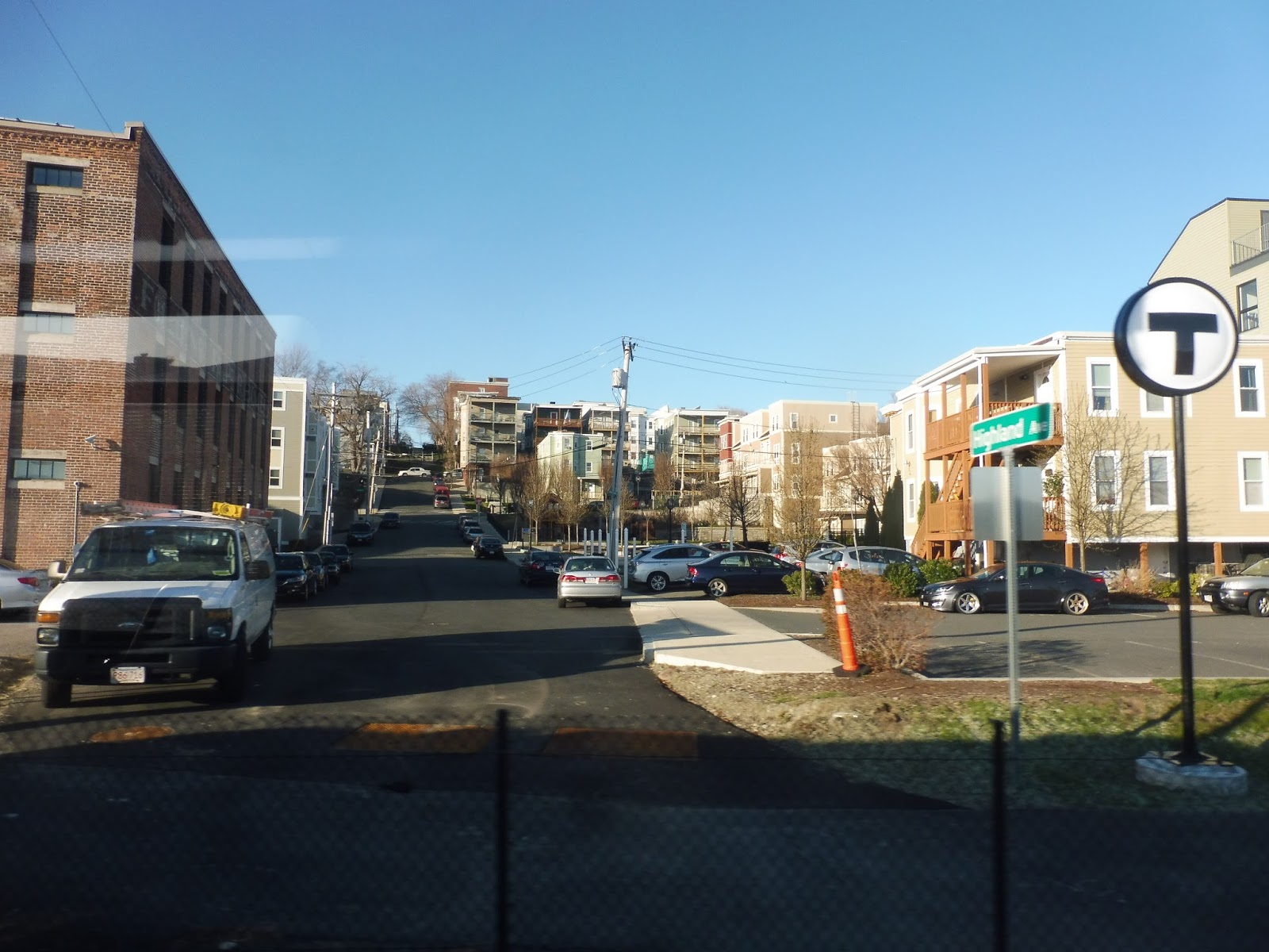The route technically starts at the Great Brook Valley Pool, but Sam and I were a little dubious of that as a starting point, so we waited at the next stop, inside the Great Brook Valley apartment development. We boarded the bus on Tacoma Street, running down through the development. Next, we turned onto Boylston Street, which had houses and businesses on one side and industrial buildings on the other.