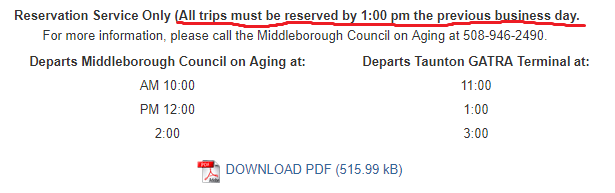 - IN ORDER TO RIDE IT, YOU HAVE TO CALL THE MIDDLEBOROUGH COA BY 1 PM THE PREVIOUS BUSINESS DAY (SO YOU GOTTA CALL BY FRIDAY IF YOU’RE RIDING MONDAY)