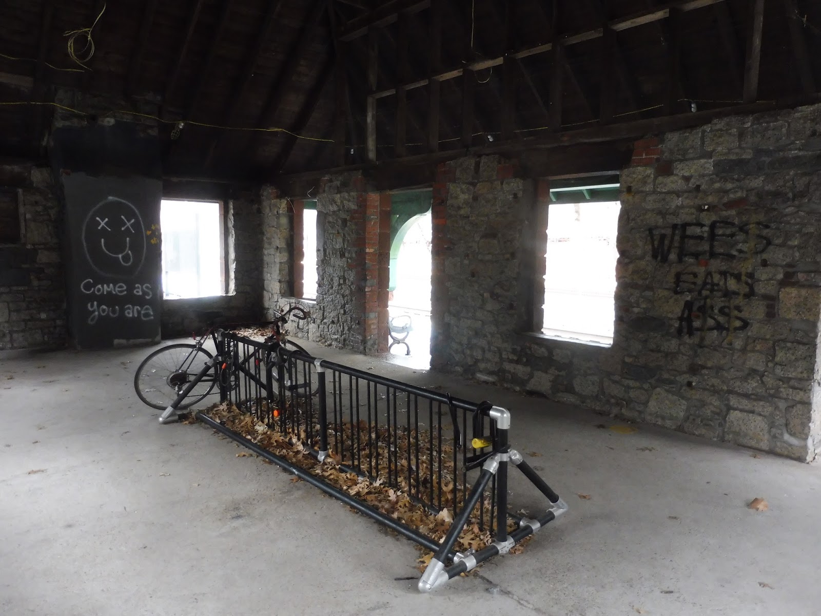 Oh…wow, this is…this is unlike any Commuter Rail station building I’ve ever seen. It’s entirely dedicated to a bike rack, but the eye is drawn to some prominent graffiti instructing visitors to “Come as you are.” There’s also a fake owl up in the rafters…? Okay, there has to be some strange Wellesley Farms cult that meets in this building!