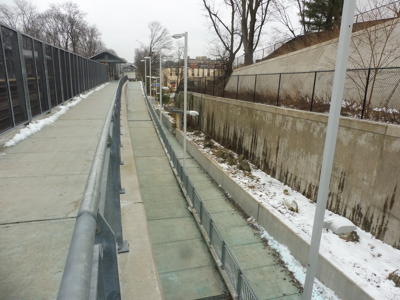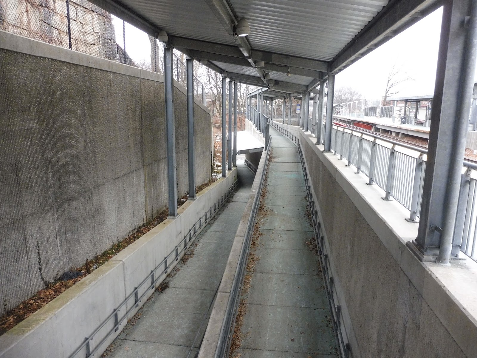 Like I mentioned, the two platforms are staggered, so it takes quite a while to get to the inbound side, which is much further north than the outbound platform. I guess this long ramp method was the best way to provide access to it, and it works, I guess. There are some shelters and benches along the way, and it eventually leads you down to the platform. Eventually.