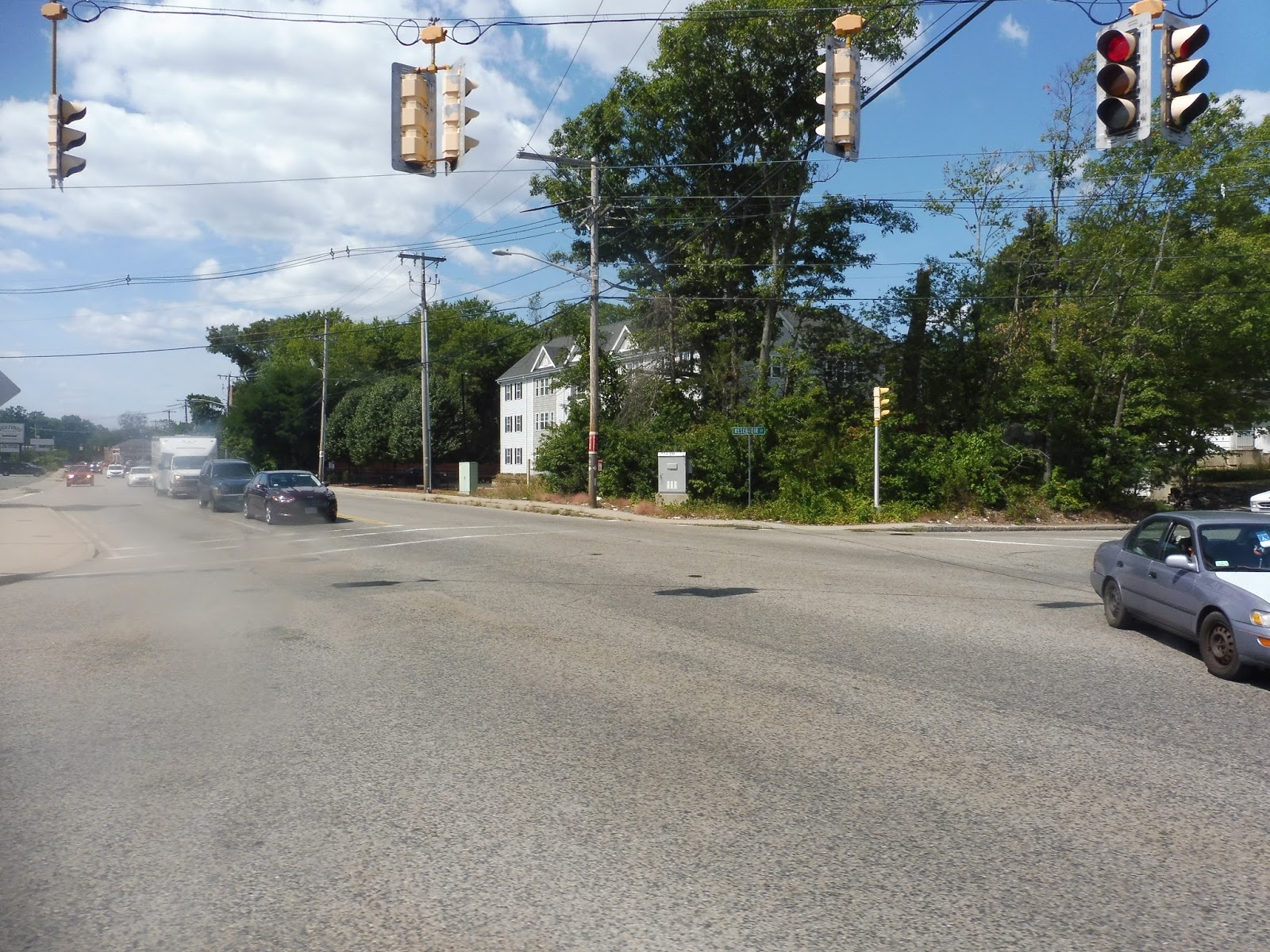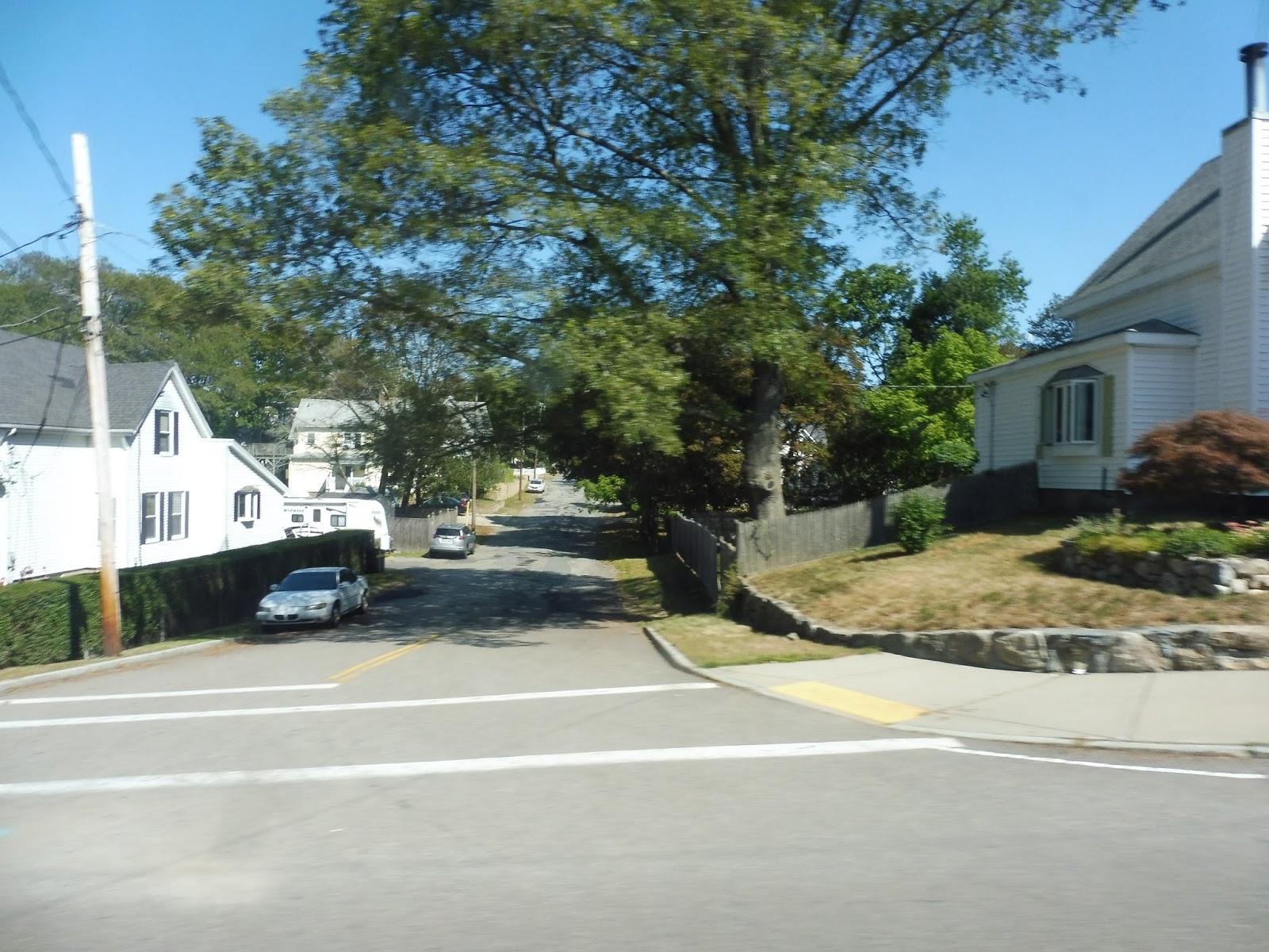 We headed down Centre Street, going under the Commuter Rail tracks and passing the bland and unoccupied buildings of downtown Brockton. It continued as Legion Parkway and got a median for parking, then we made our way to Elm Street via Warren Ave. There were various buildings including a school, a church, and an apartment building, but it soon devolved into mostly suburban houses.