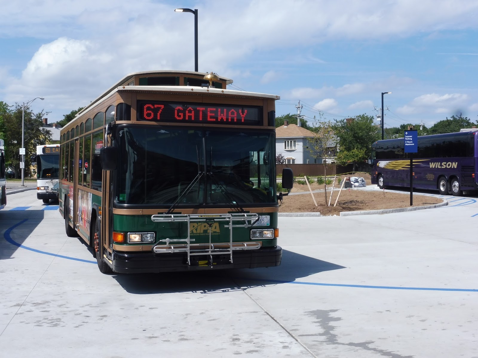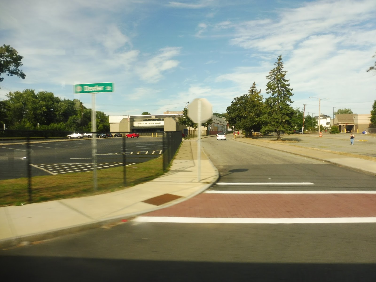 The industrial buildings withered away slowly and got replaced by the occasional business. Eventually we merged onto George Street, passing a cemetery and going over I-95. We curved onto East Street next, which took us past the mostly vacant buildings of downtown Pawtucket. Making a few one-block twists, we arrived at the Pawtucket Transit Center.