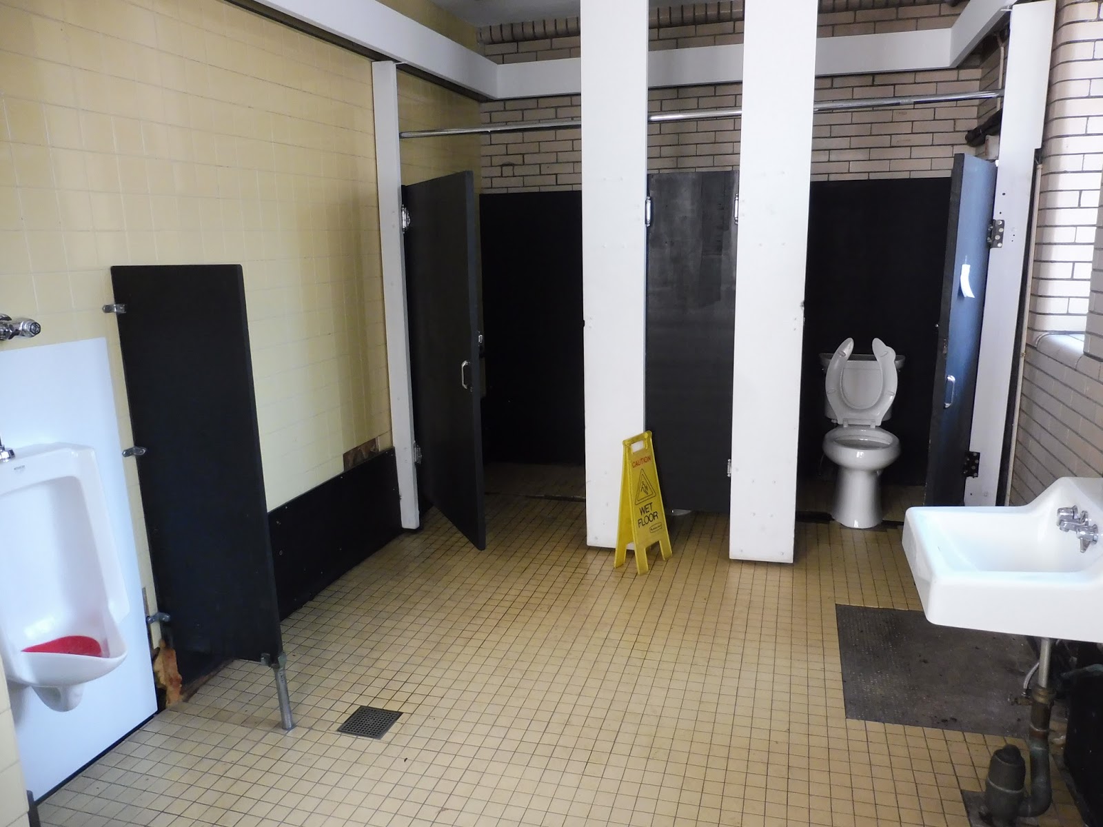 Leading around the side of the building, there’s an area with a few more benches and a hallway that goes to the “Sanitary Station.” That’s code for the bathrooms, with both men’s and women’s rooms, although the MVRTA considerately put up signs saying that one can use the bathroom consistent with their gender identity. That being said, these are like prison bathrooms. I mean, just look at it! Ew!