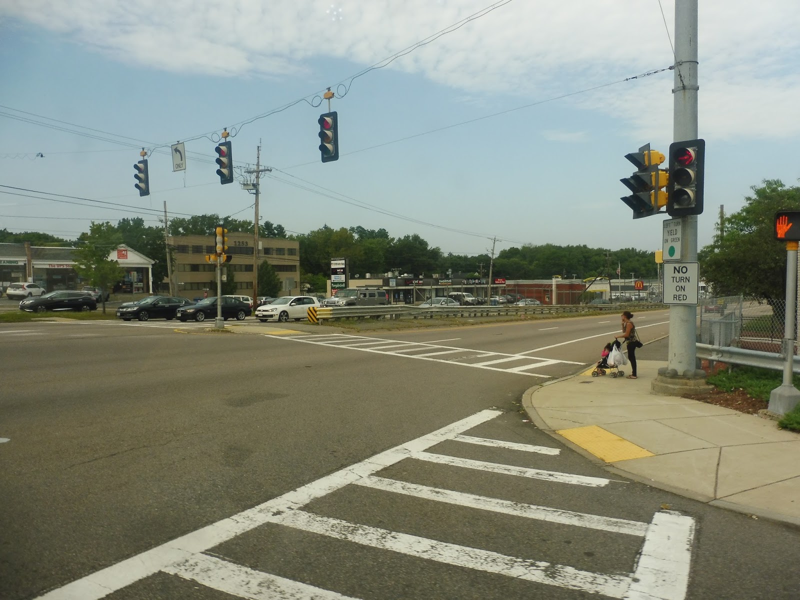 There was a brief residential break, but at the intersection with Route 30, there was some more retail, this time in some more modern developments. We crossed I-90 again, going under it this time, after which it was a mix of houses and occasional suburban business developments. Once we got to Route 9, we had to deviate into 9/27 Plaza, a rather boring shopping center (albeit with plans to become more interesting). Strangely for the MWRTA, we were actually early, and we had to wait a few minutes before leaving.