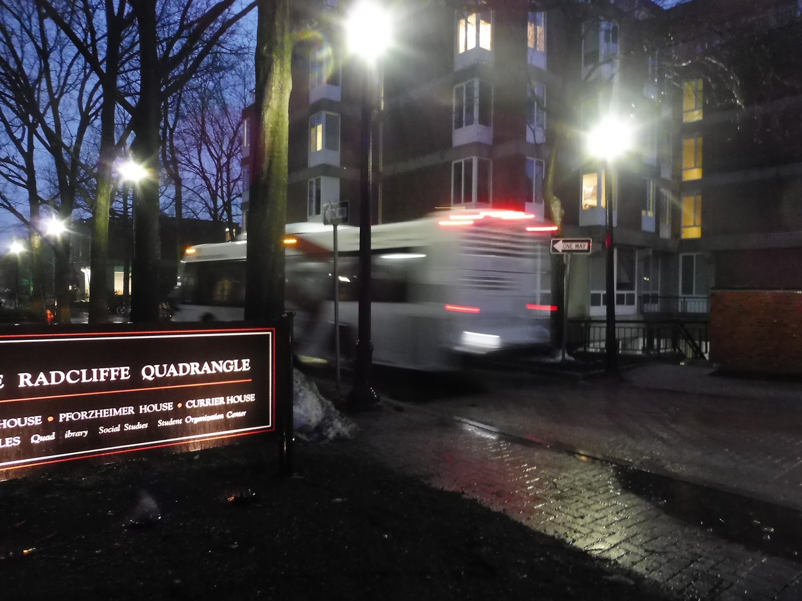 Oxford Street curved around to become Kirkland Street, and we came up alongside the beautiful Memorial Hall building. Our driver chose not to enter the busway, so we turned right onto Quincy Street, then Cambridge Street. Outside of the Cambridge Rindge and Latin High School, we turned onto Felton Street, then Broadway, then finally Quincy Street again.