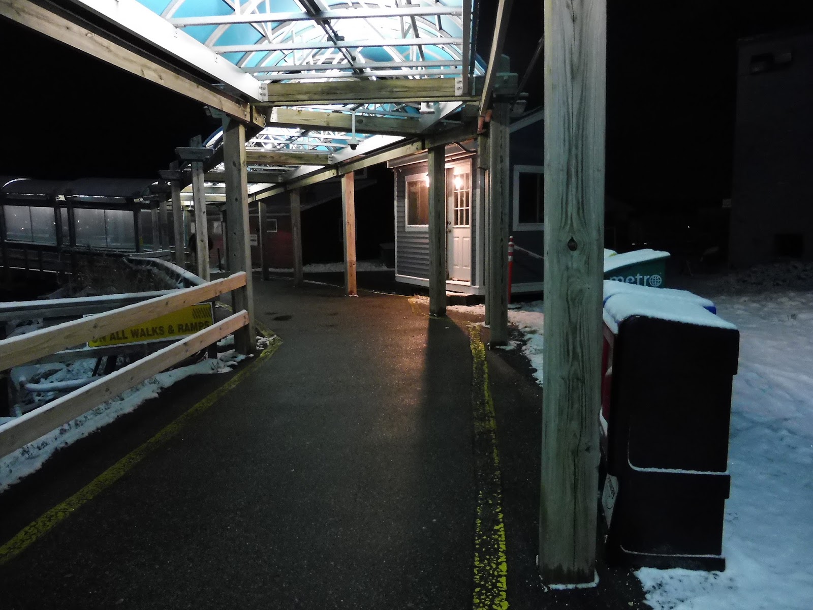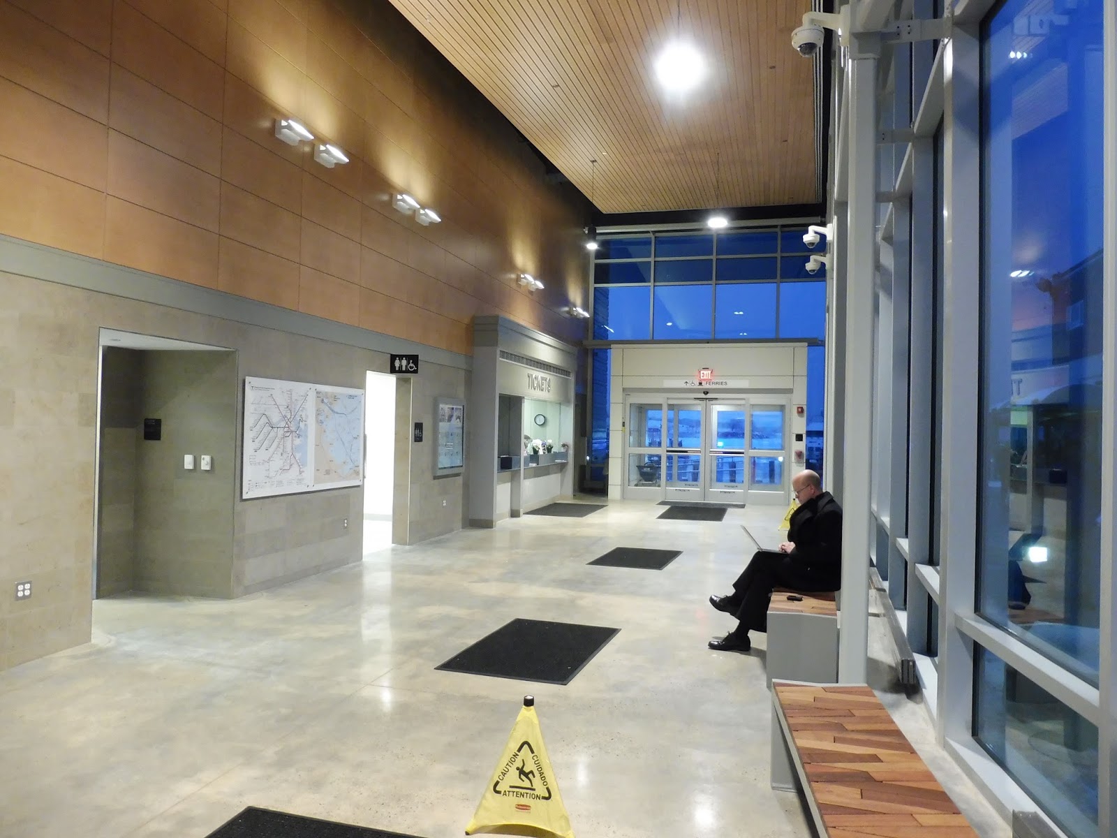 I think the walkway out to the dock is a remnant from the old terminal, since it didn’t seem as modern as everything else. Still, it did its job well, and I liked the well-lit blue shelter over the whole thing. I can understand the benches that were along the pathway, but the newspaper boxes? That seems like the wrong place to put those.
