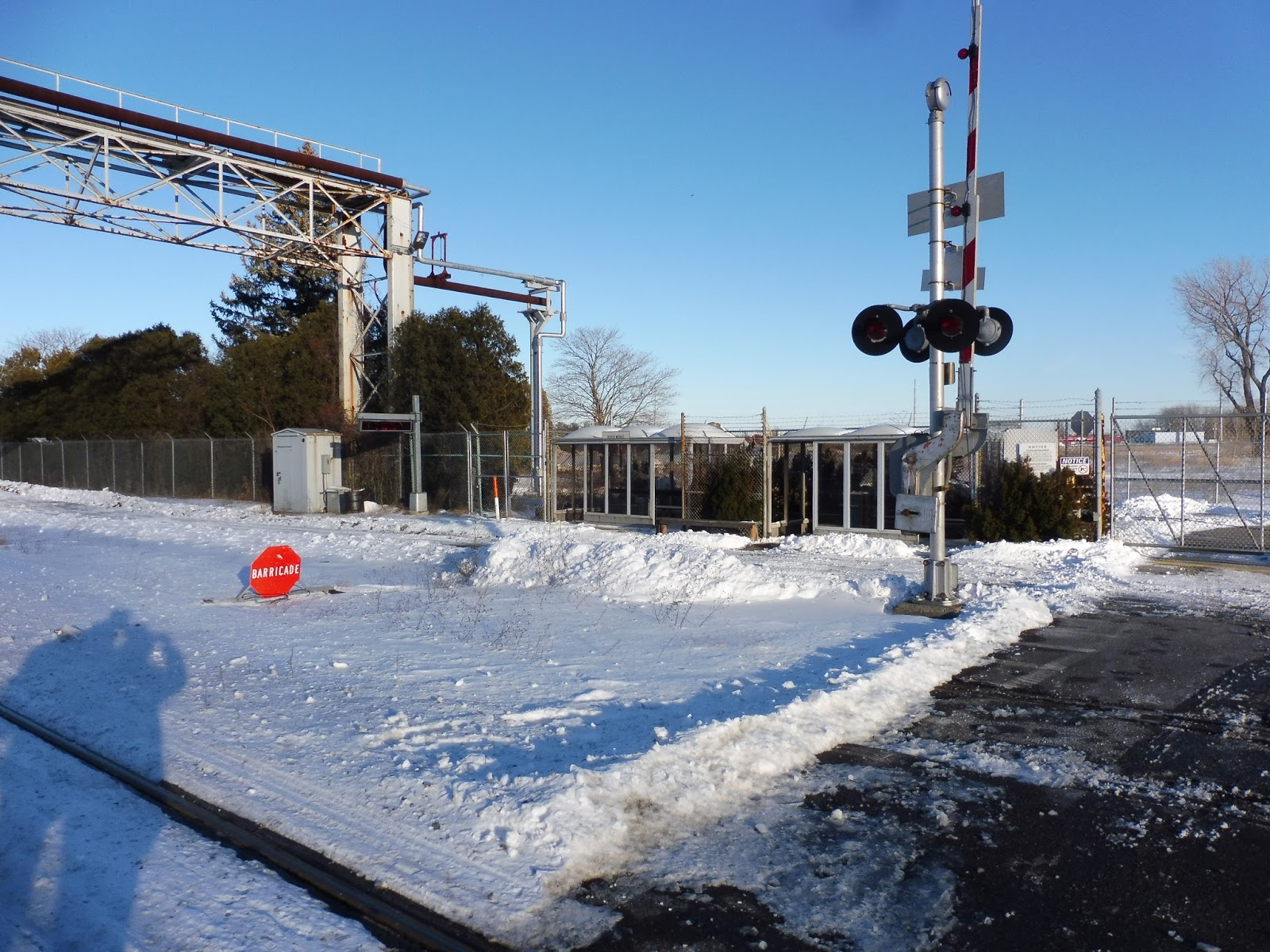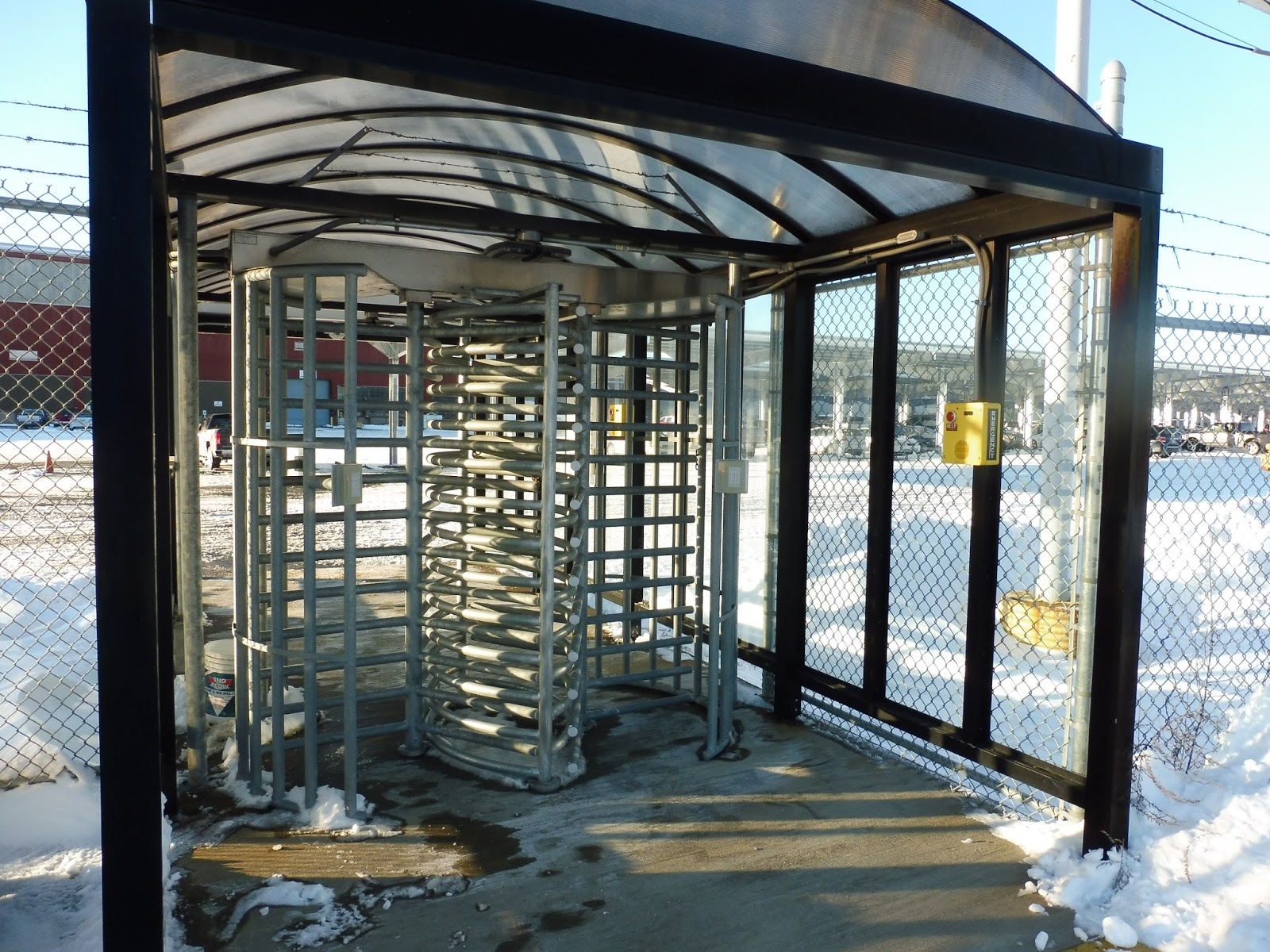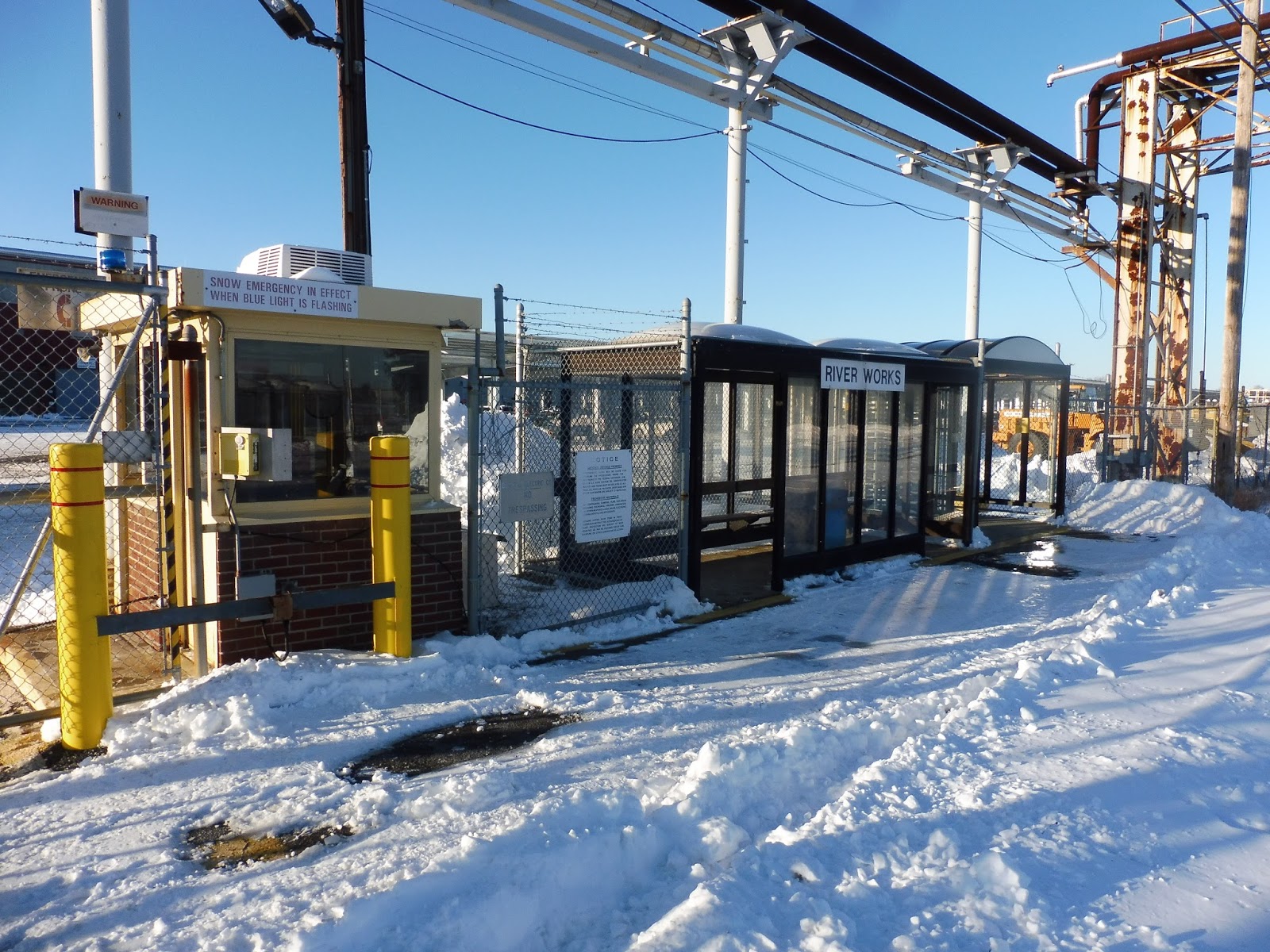 Now, as a big yellow line running along the ground indicates, the inbound shelter is actually within GE property. It’s arguably the best shelter here – it’s modern, big, and features a long bench with a wastebasket. Also on this side is another imposing gate, this one leading into the facility itself. We actually saw this one open, as the operator shift for the Commuter Rail drawbridge was changing, and I can now say that it’s very creaky when it moves.