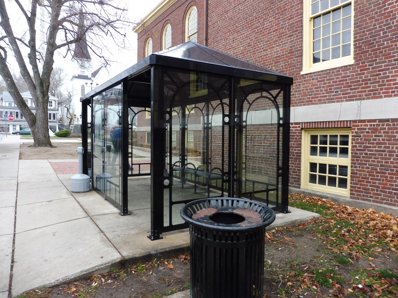 The platform at North Scituate seems to go on forever. It has a shelter near the path, a stretch of open space, another shelter on the other side of the parking lot, and more open space into the woods! The open parts don’t offer too much, featuring only ads and sparse benches, but the shelters have maps, schedules, more seating, and wastebaskets.