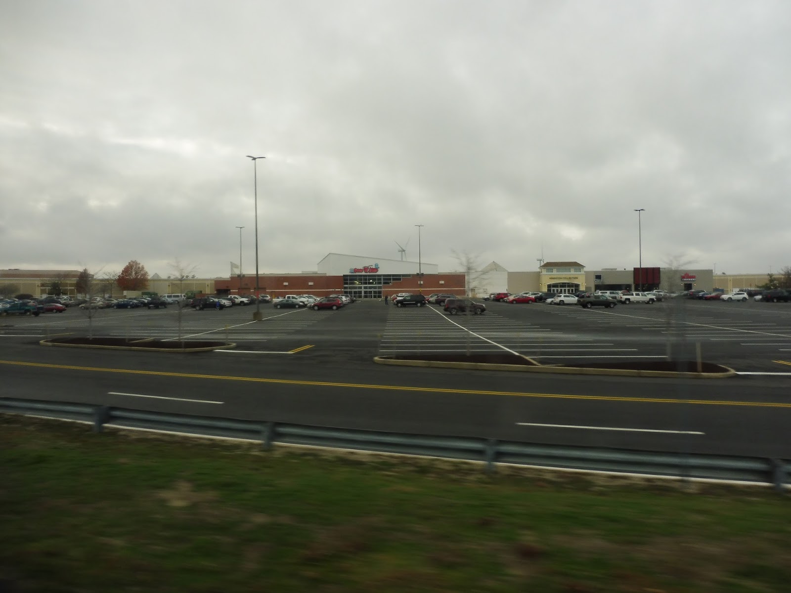 We ran through forest for a bit, then it became industrial. Fittingly, we soon turned onto Industrial Park Road, going under Route 44 and passing various suburban offices (as well as the GATRA bus yard). Eventually we turned onto Christa McAuliffe Boulevard, which became Colony Place – we were serving another mall!