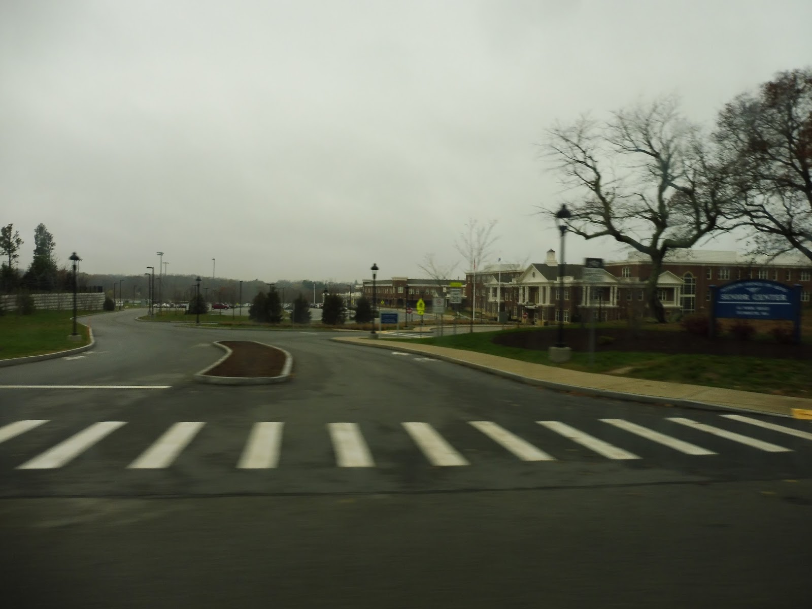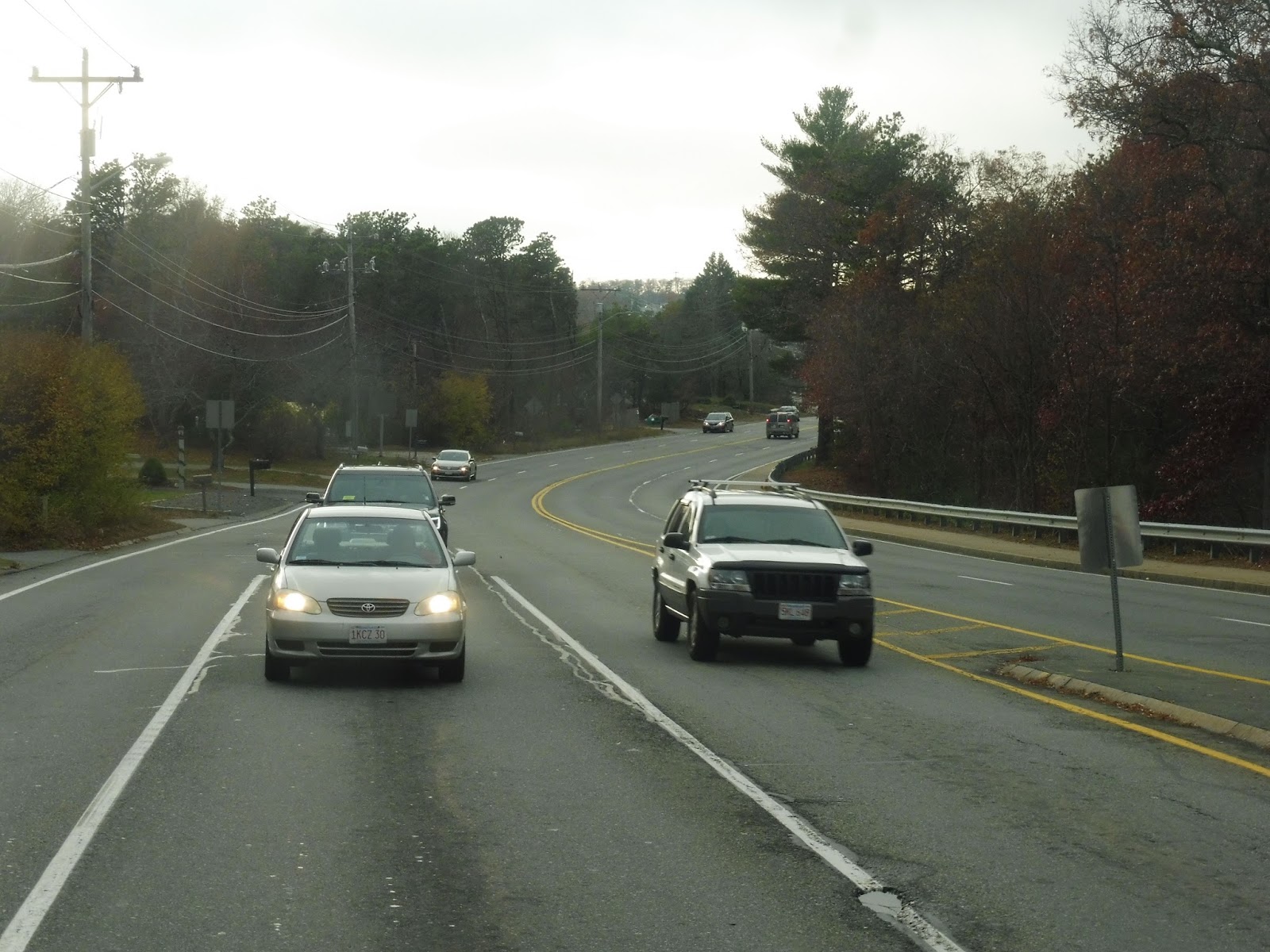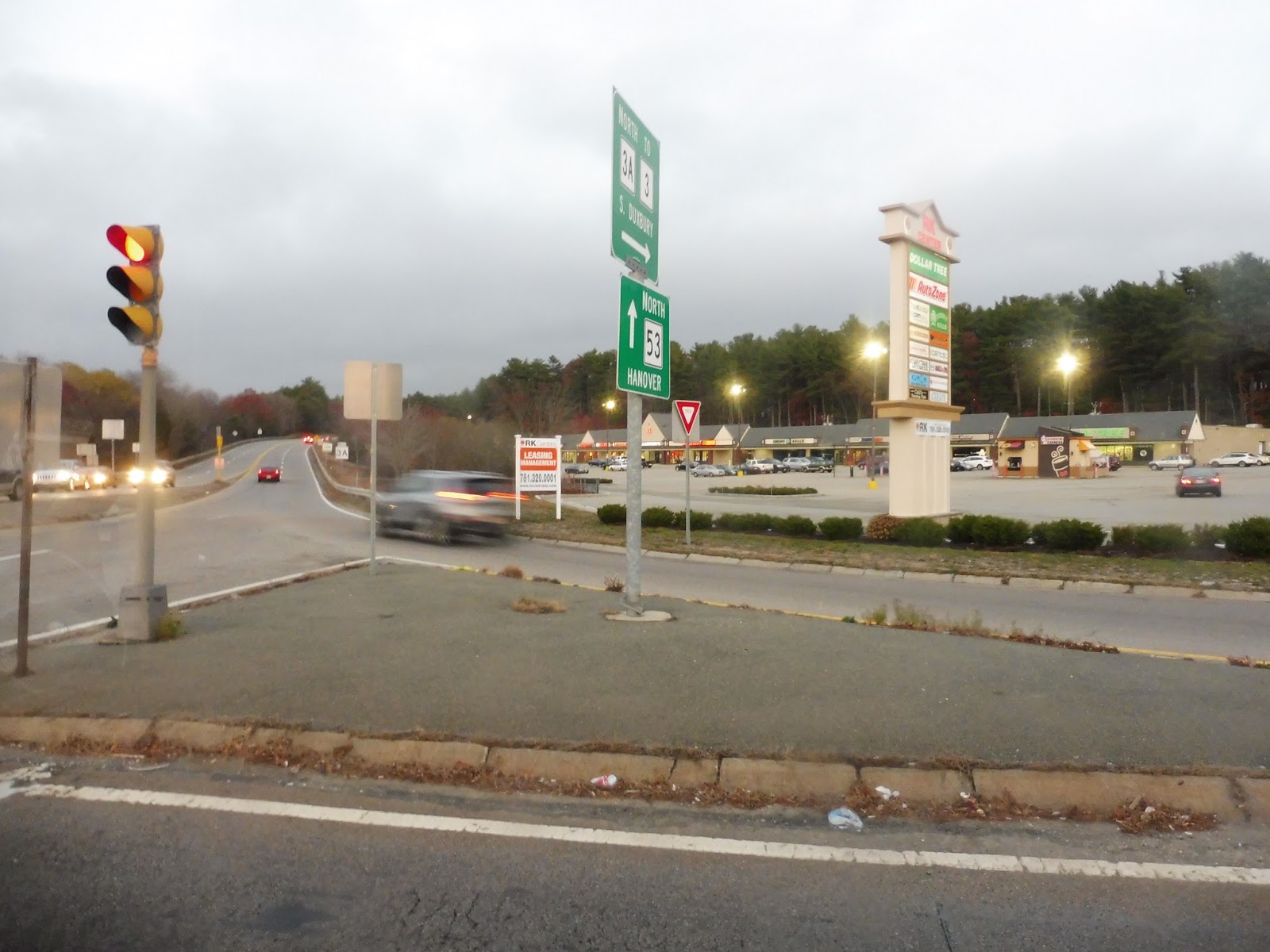 There were lots of houses around, as well as a police station, but after a short marsh, it became suburban businesses with parking lots. We had another deviation here to serve “Marshfield Center”, a fake modern town center that was basically just a mall. After some more businesses, we merged onto Main Street.