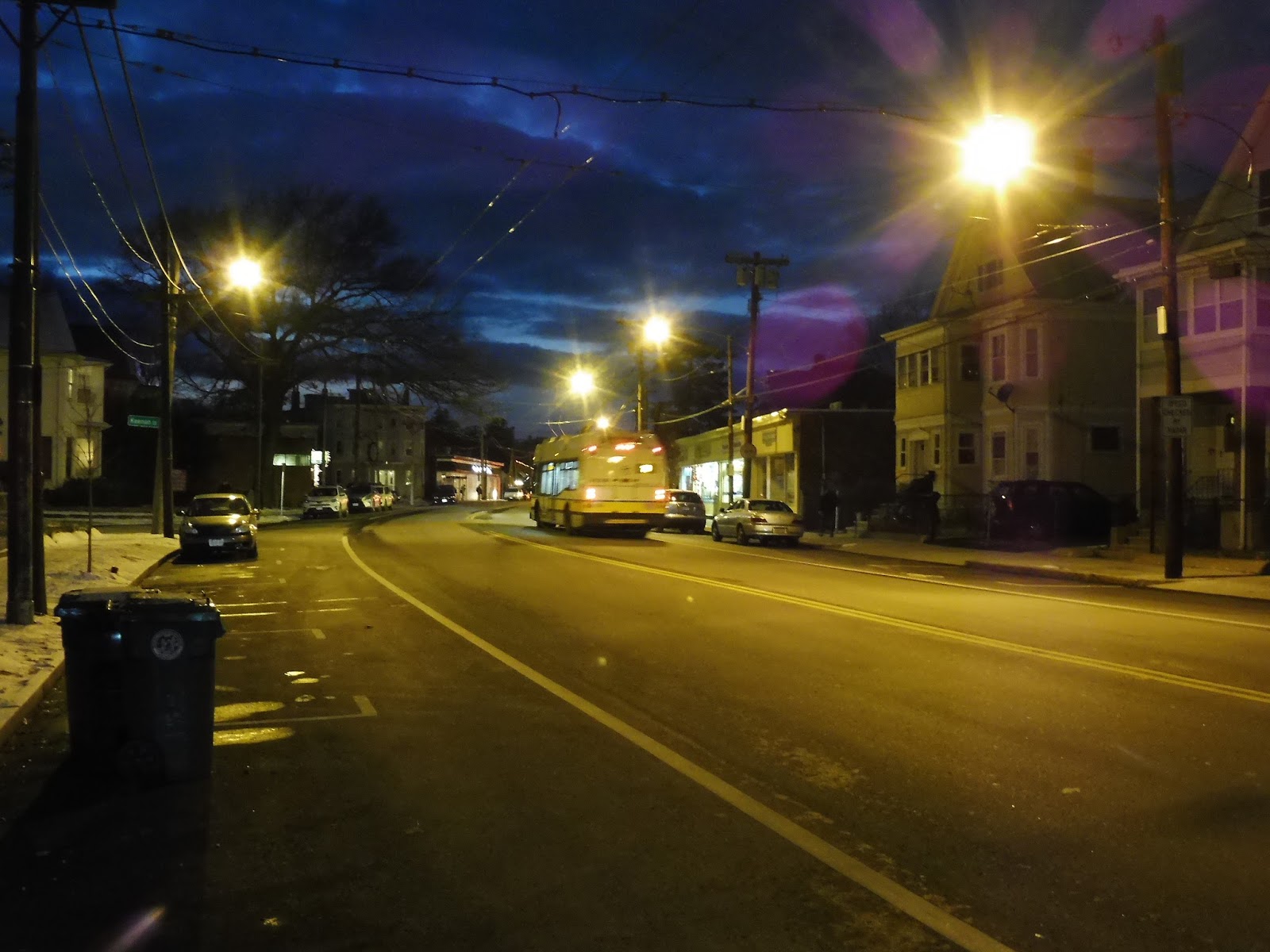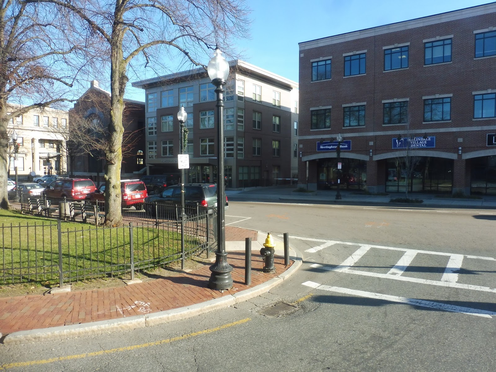 Soon dense apartments started to line the road, but we still got some businesses at certain intersections. After going by a park, we entered Roslindale Village, where all of a sudden there was retail all over. We curved around the town common (decked out in Christmas decorations), then continued down Washington Street, which was once again residential.