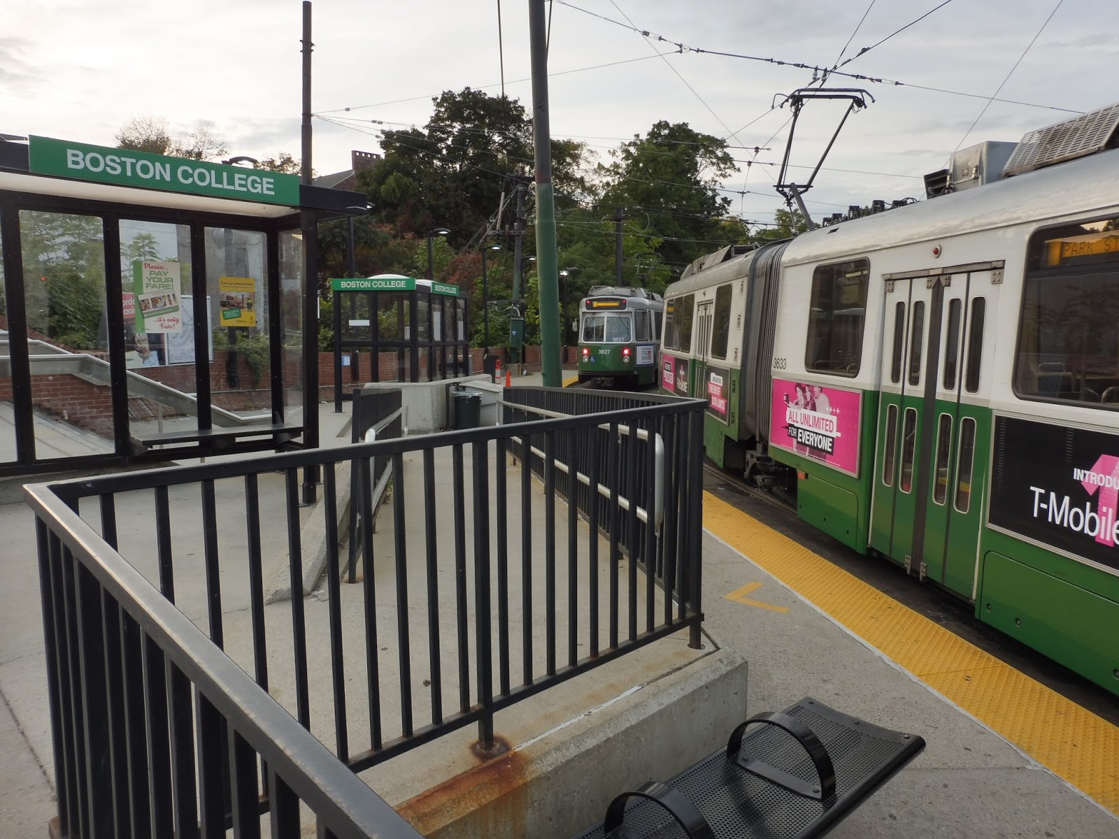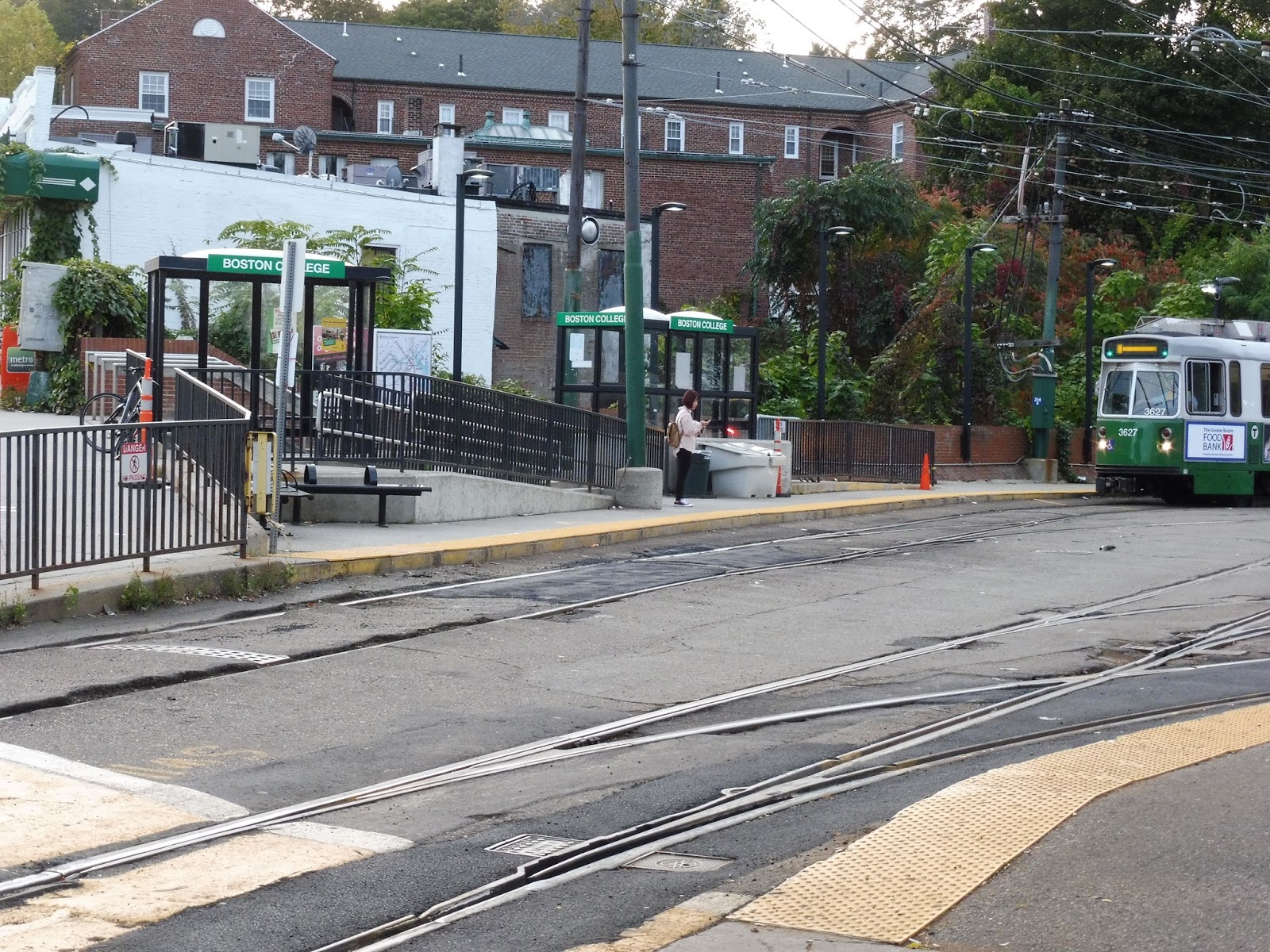 The drop-off system at Boston College is interesting, to say the least. Normally, trains let out along a platform within the station complex that stretches around a building for MBTA employees. Simple enough, right? But SOMETIMES – ostensibly when three-car trains are operating – trains will let out at an in-median platform on Commonwealth Ave! Now isn’t that just a wee bit confusing?