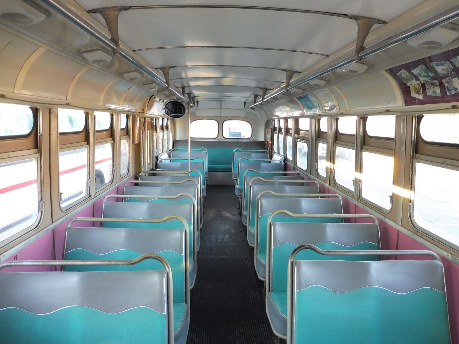 The inside of the bus, showing the seating, AC, and scroll board up front. |