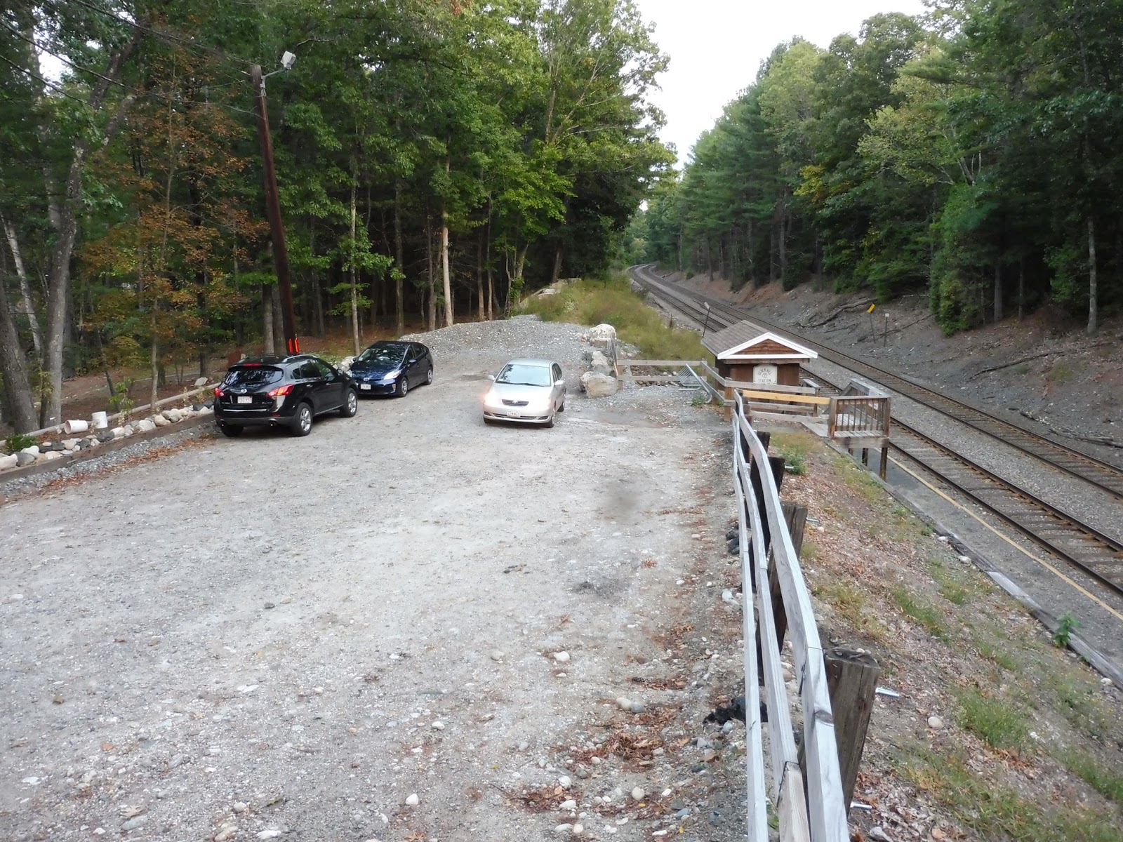 So…the parking here is a bit dubious. The MBTA website says it has none, but that patch of gravel next to the station is most definitely used by cars. Of course, there’s no rhyme or reason to it – some people park forwards, some park backwards, and some just use it as a pick-up area. The station also has a bike rack, which is locked to the fence (arguably not a necessary precaution in Weston, but I digress).